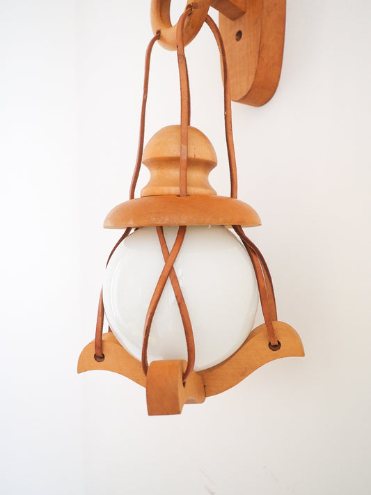 Lanterne murale vintage en bois et cuir – Style scandinave, années 60