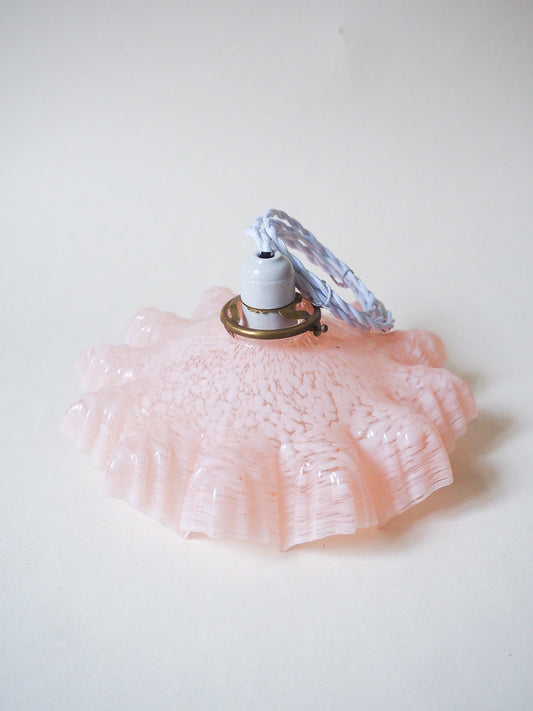 Suspension vintage verre de Clichy - forme drapé – moucheté rose + fil en tissu tosadé neuf
