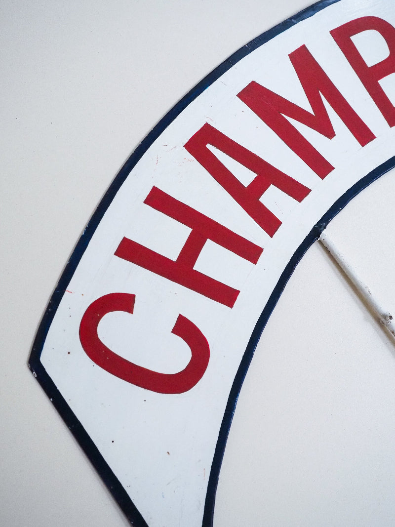 Magnifique enseigne ancienne, en métal, probablement issue d’un ancien commerce de village. Cette plaque arrondie est peinte des deux côtés.