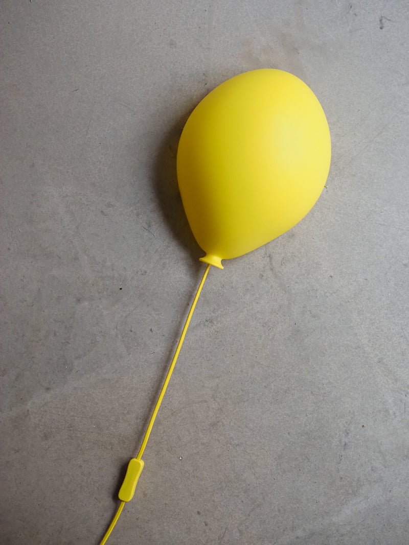 Applique murale vintage IKEA en forme de ballon de baudruche jaune, éditée dans les années 90/2000. Le câble électrique descend comme un fil, renforçant l’illusion du ballon flottant.