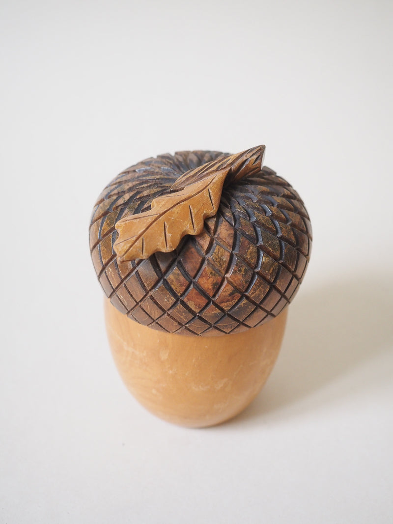 Petite tabatière / boîte décorative en buis, de tradition art populaire, sculptée en forme de gland.