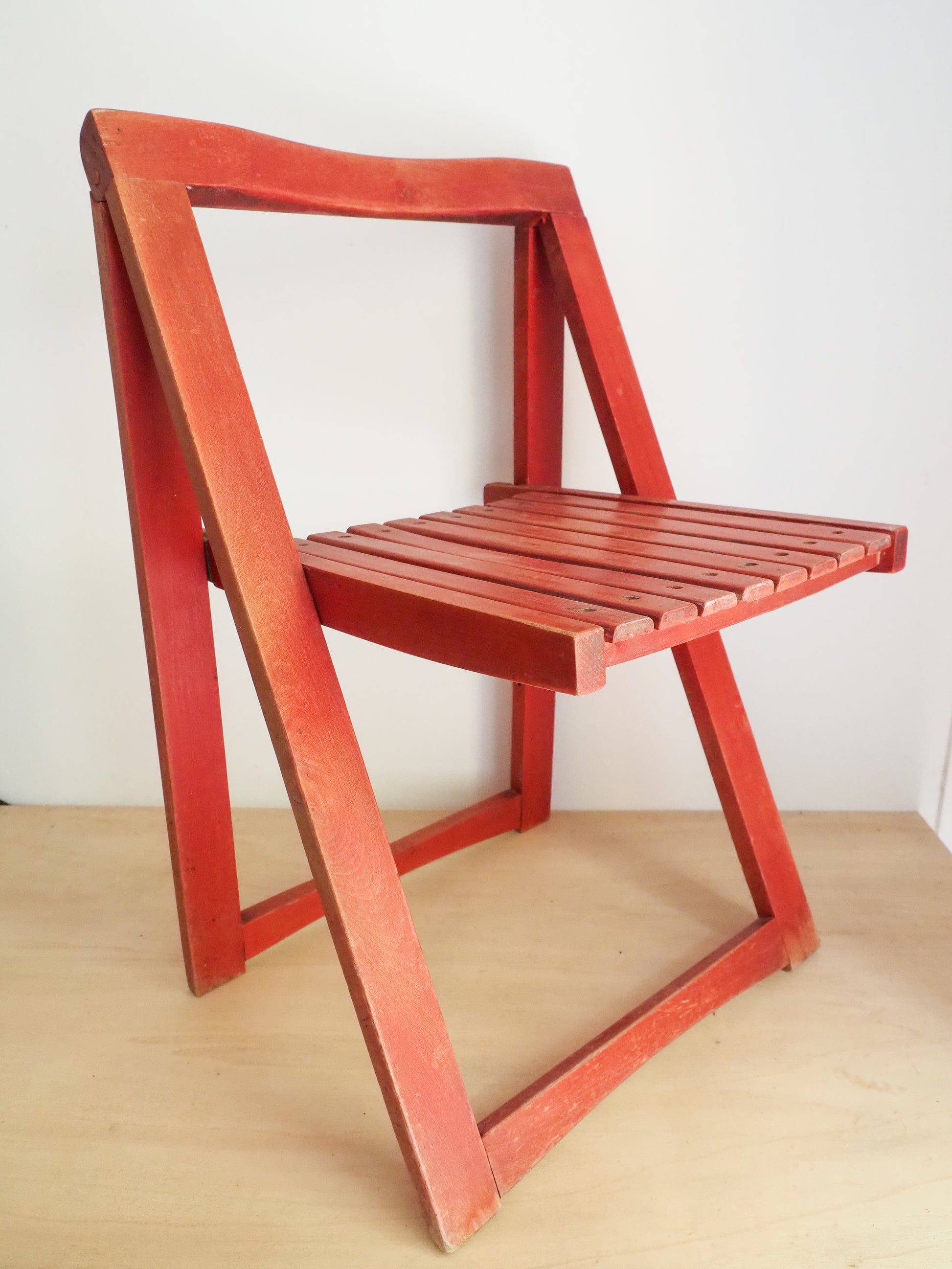 Très belle chaise pliante conçue par Aldo Jacober pour l’éditeur Alberto Bazzani (Italie, années 60/70). Réalisée en hêtre massif teinté rouge, elle se distingue par son profil triangulaire épuré, son mécanisme pliable ultra-compact, et une silhouette fonctionnelle et élégante.