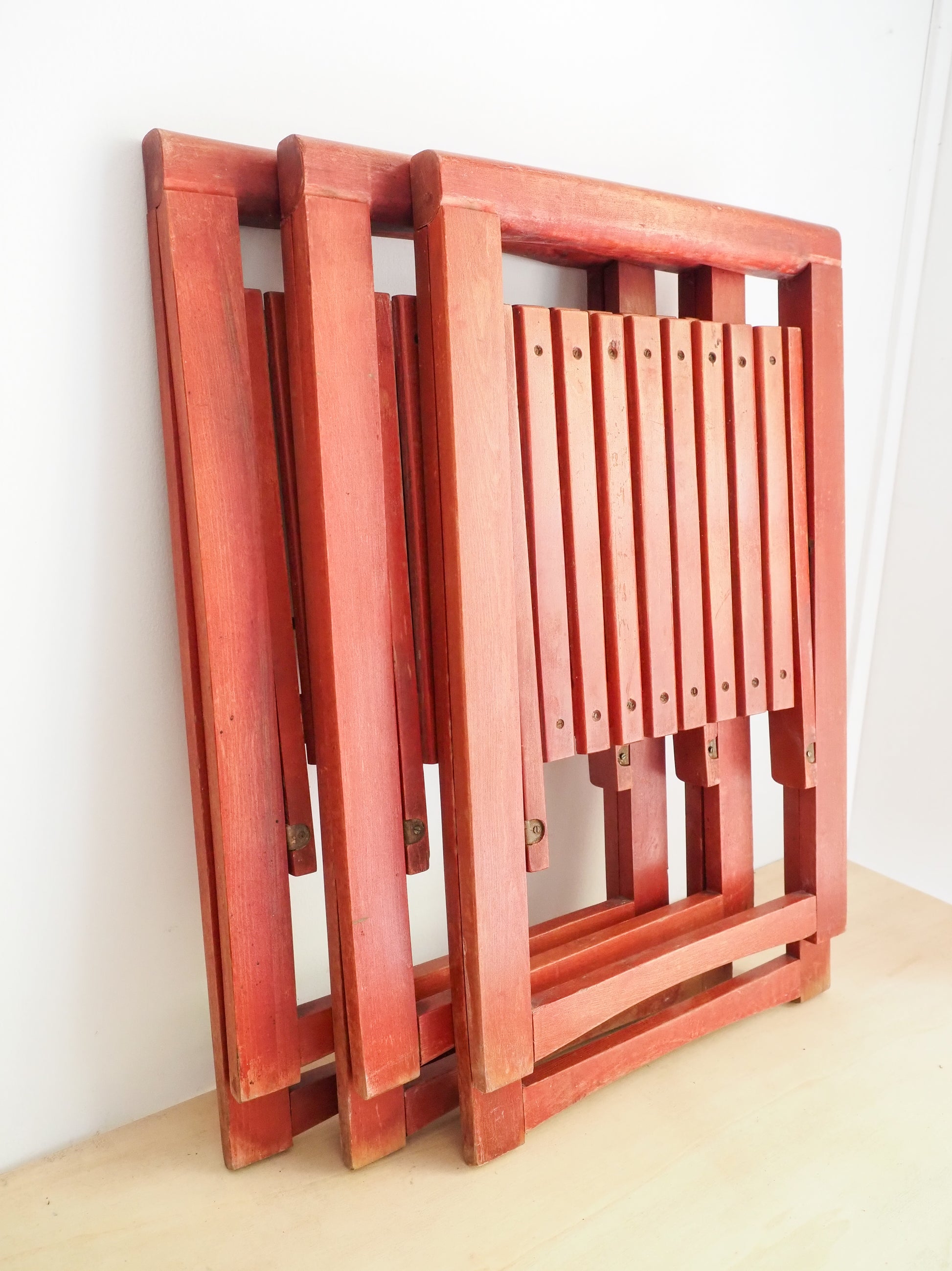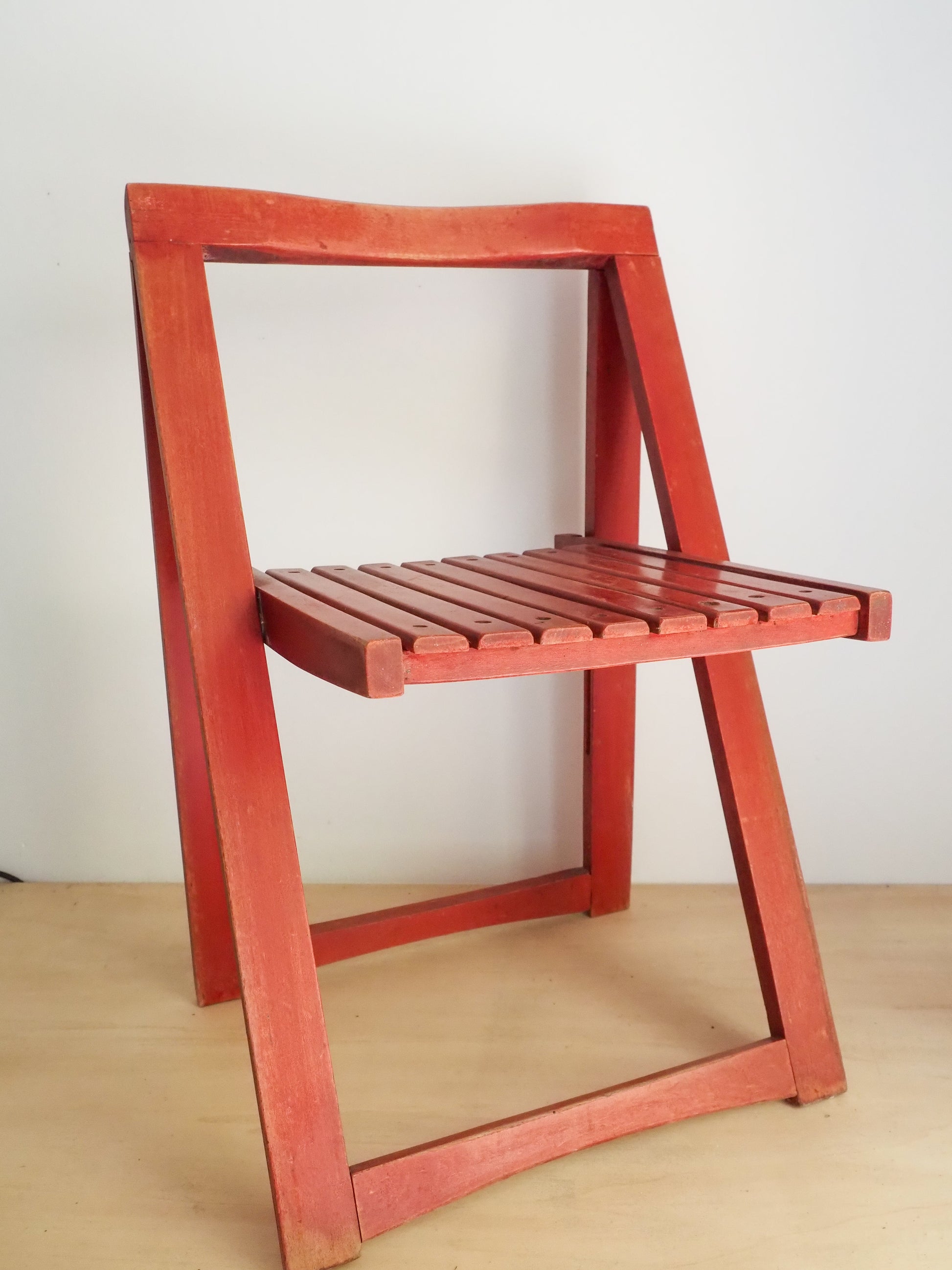 Très belle chaise pliante conçue par Aldo Jacober pour l’éditeur Alberto Bazzani (Italie, années 60/70). Réalisée en hêtre massif teinté rouge, elle se distingue par son profil triangulaire épuré, son mécanisme pliable ultra-compact, et une silhouette fonctionnelle et élégante.