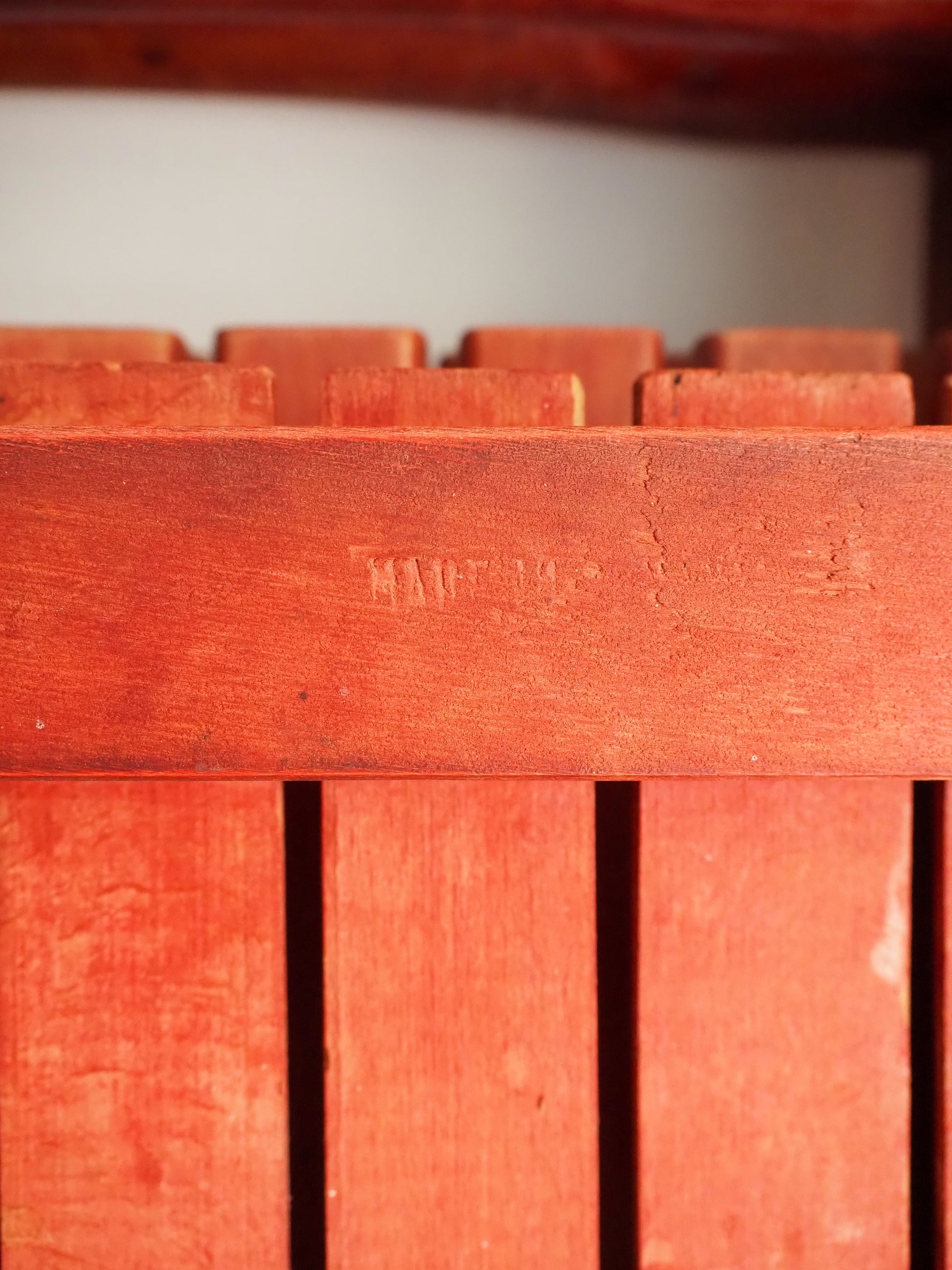 Matériau : Hêtre massif, teinté rouge (patine vintage visible, usure douce)