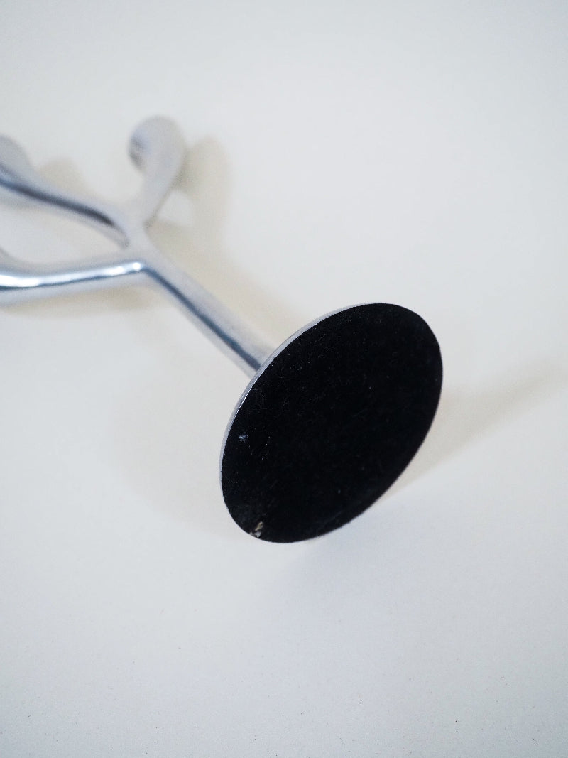 Chandelier vintage à la forme organique et épurée, conçu pour accueillir 3 bougies. Sa structure minimaliste en métal chromé repose sur un pied tulipe stable et élégant. Une pièce au design sobre, typique des années 70-80.