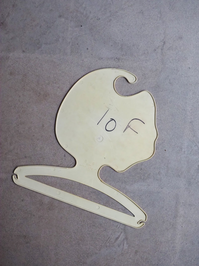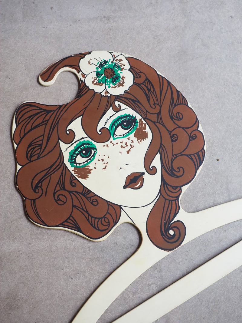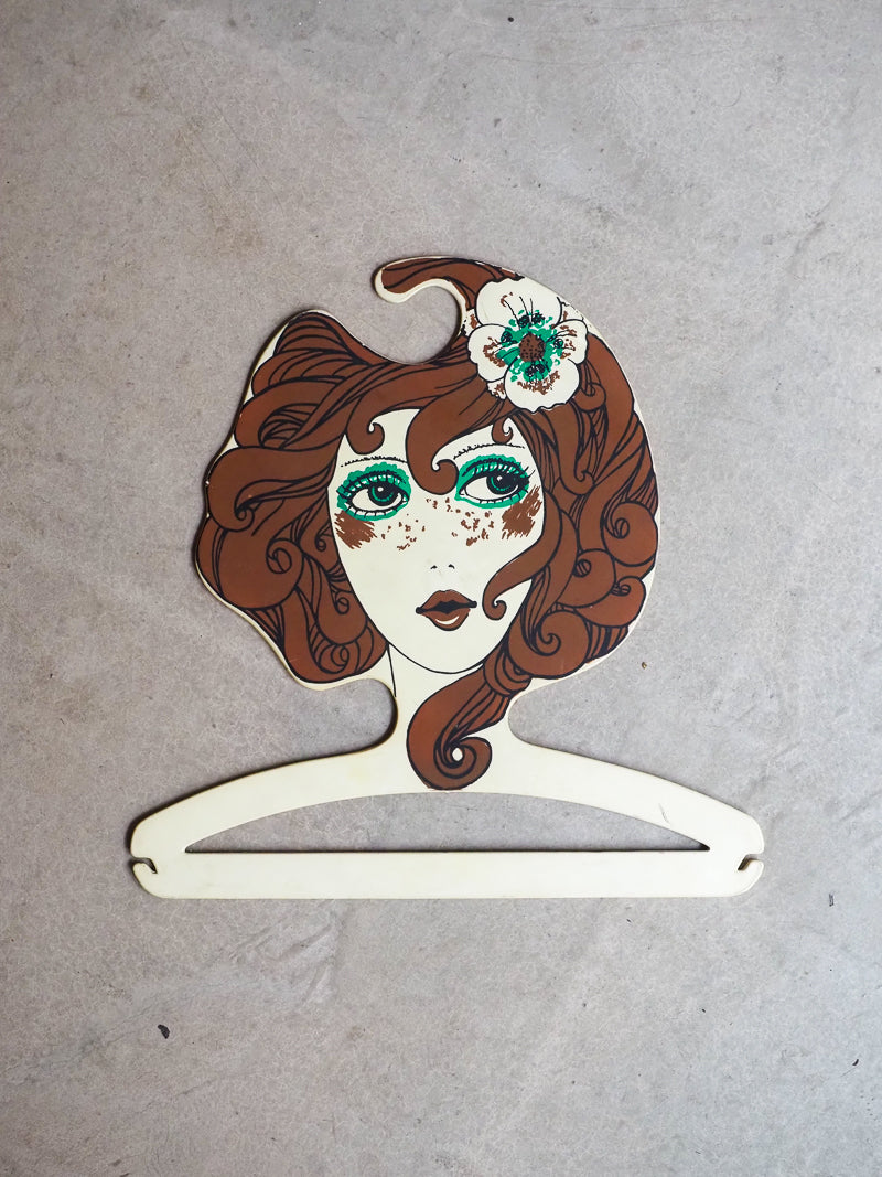 Original cintre en plastique vintage datant des années 70, surmonté d’une tête de femme stylisée, dans un design typiquement rétro. Elle porte une fleur verte dans les cheveux assortie à son maquillage sur les yeux.