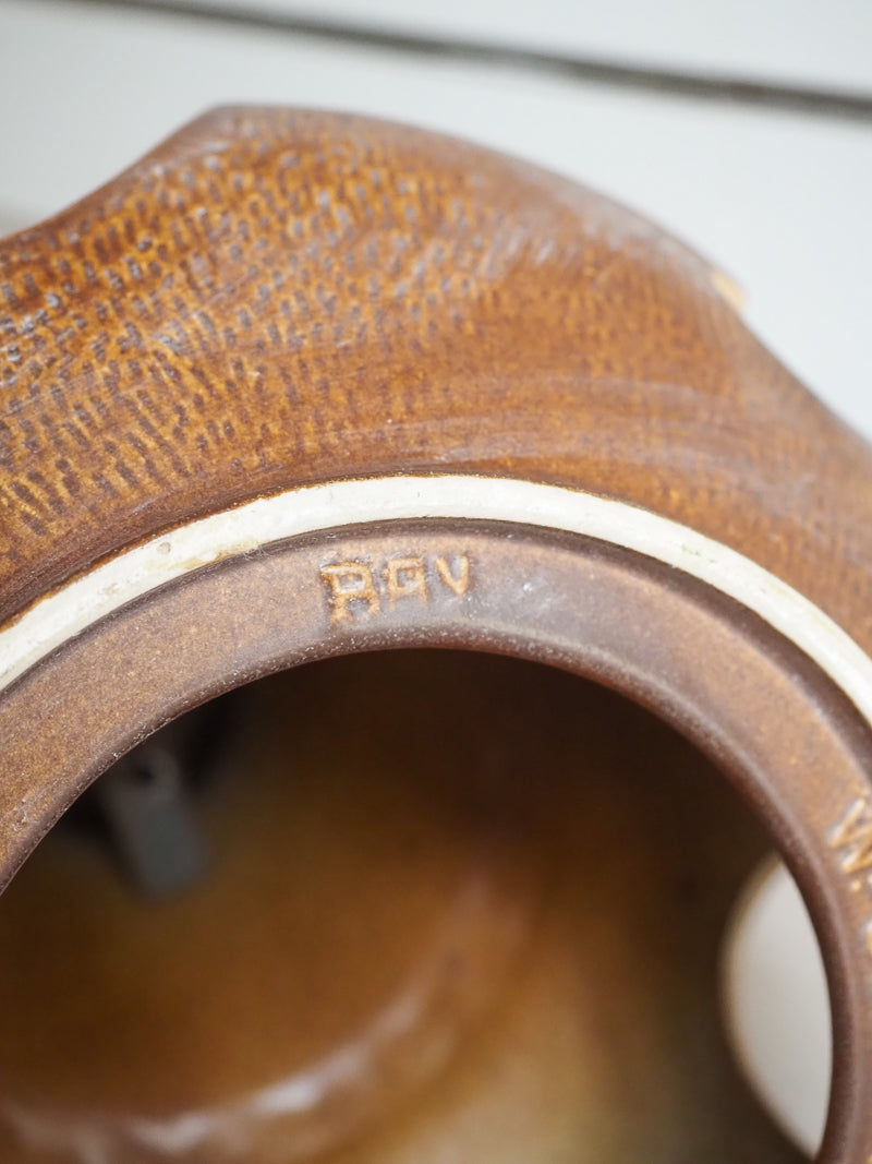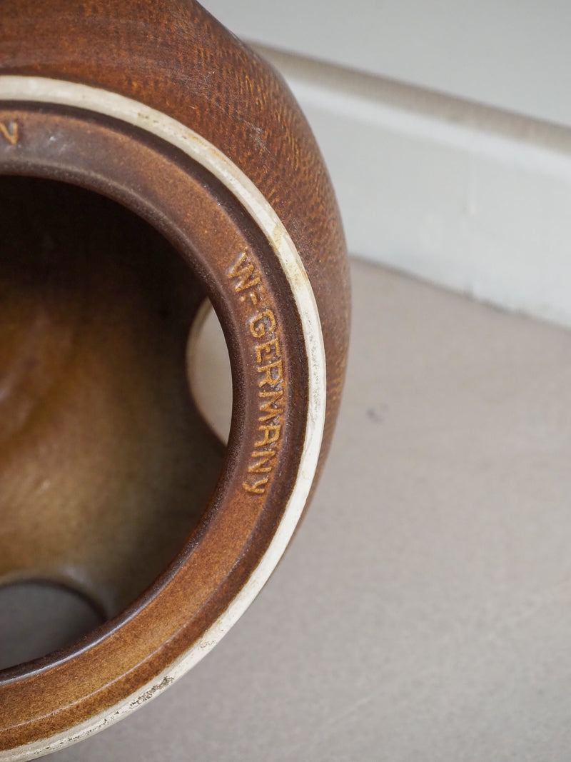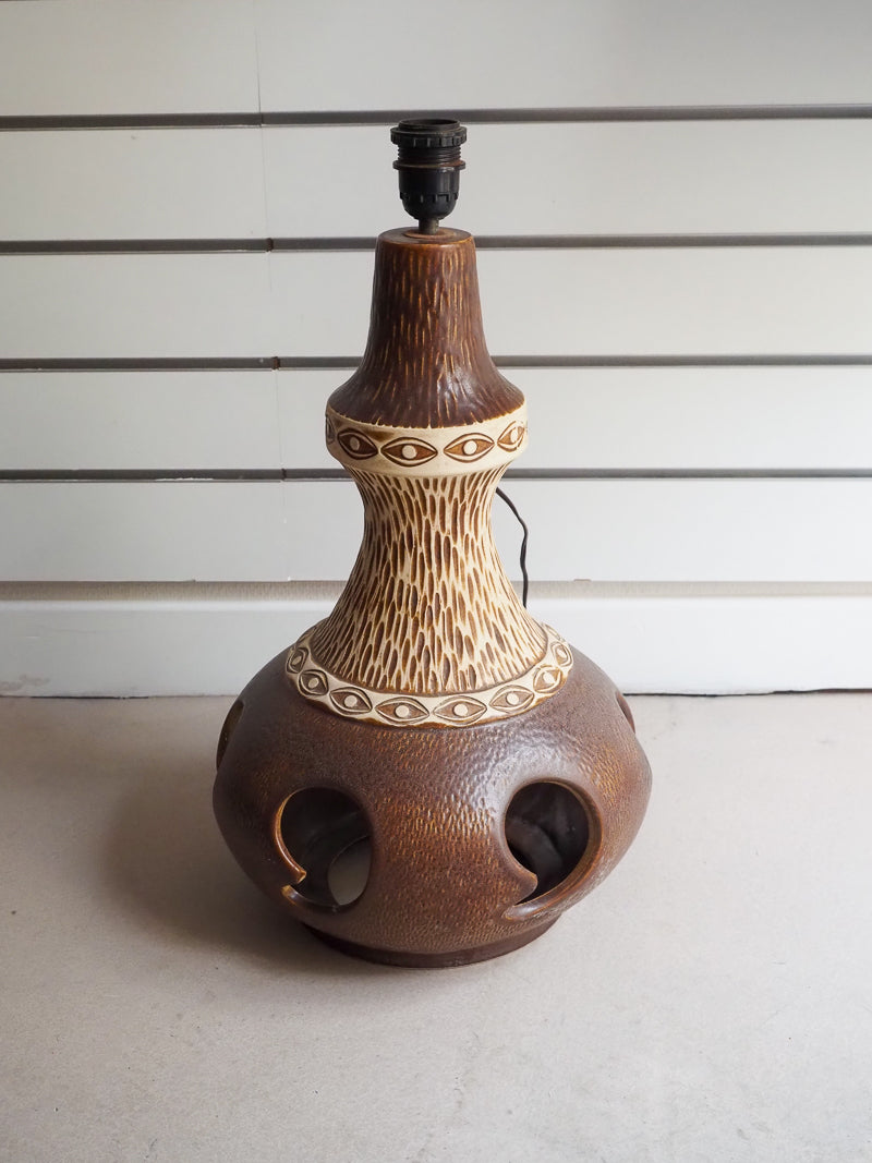 Superbe lampe de sol vintage en céramique ouest-allemande, signée Bay Germany, une manufacture emblématique. Cette grande pièce des années 60 est très belle avec sa forme sculpturale, sa teinte marron et ses détails ajourés tout autour du corps de la lampe.
