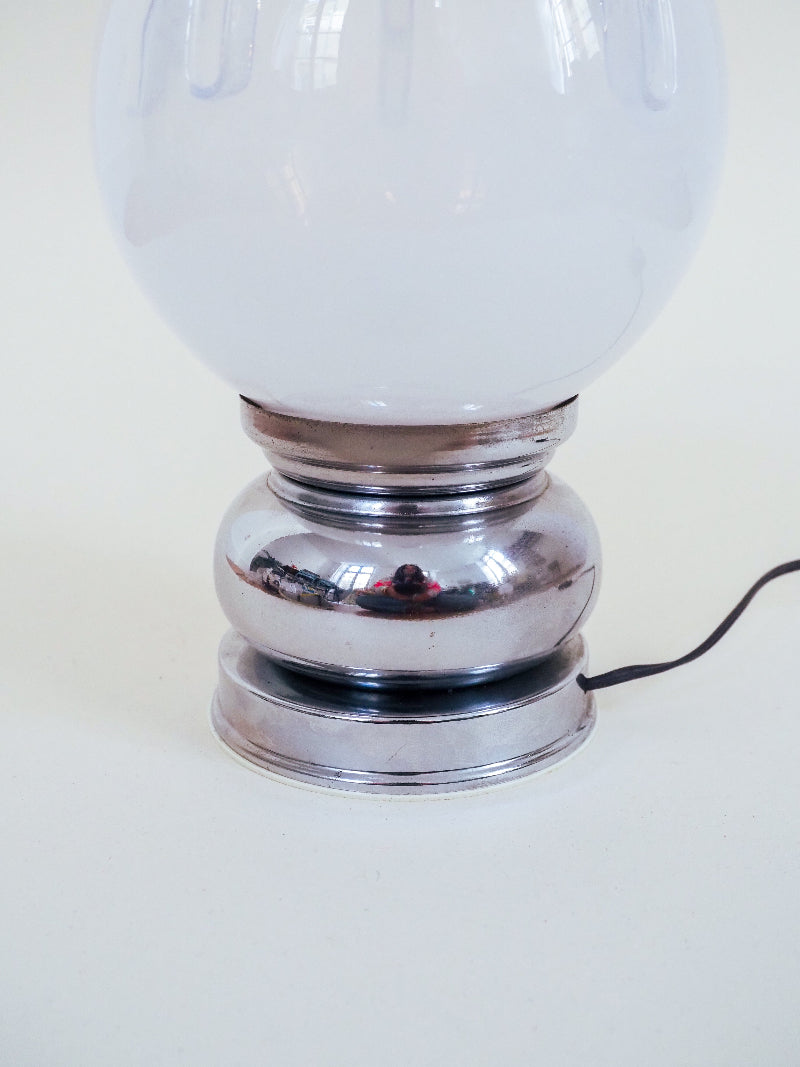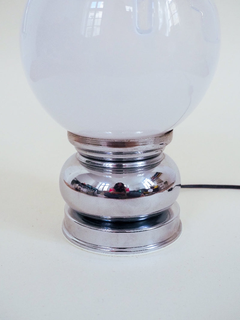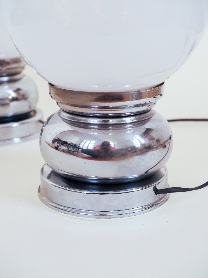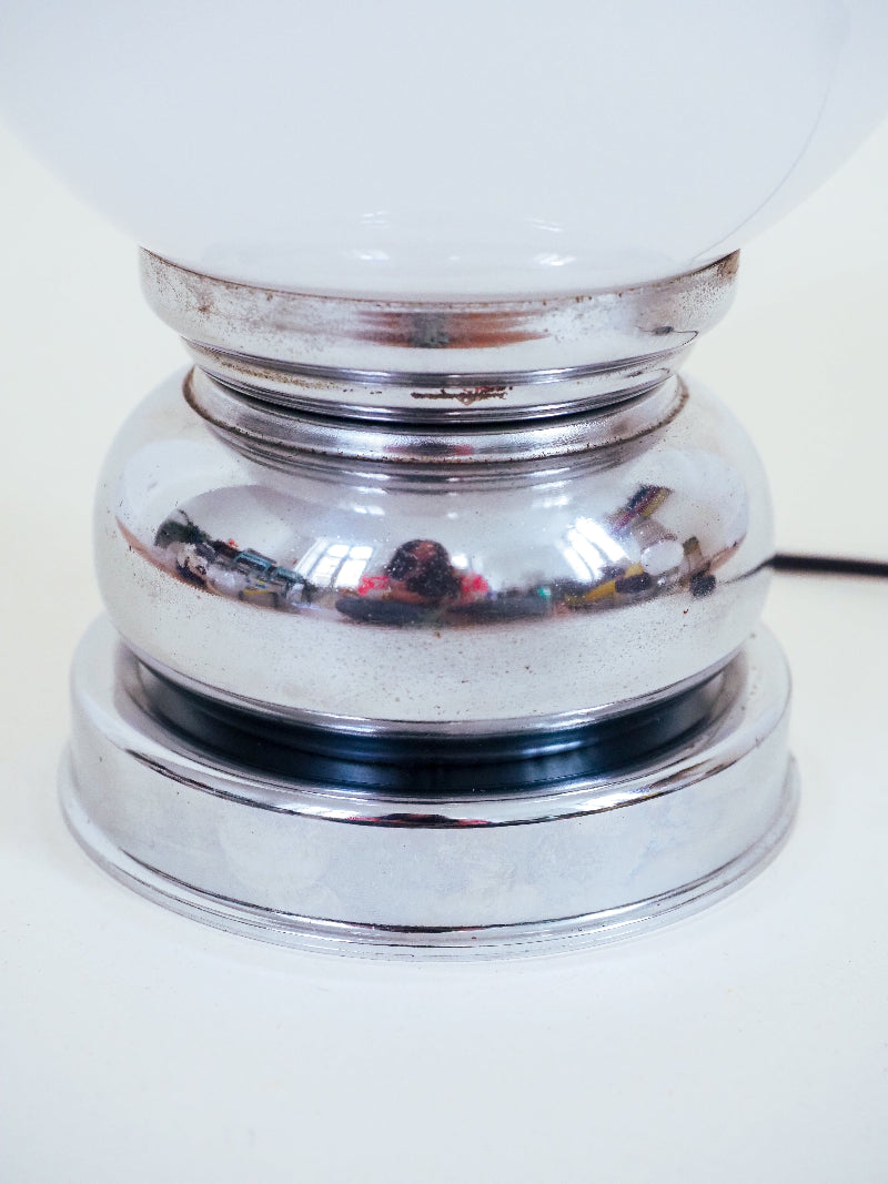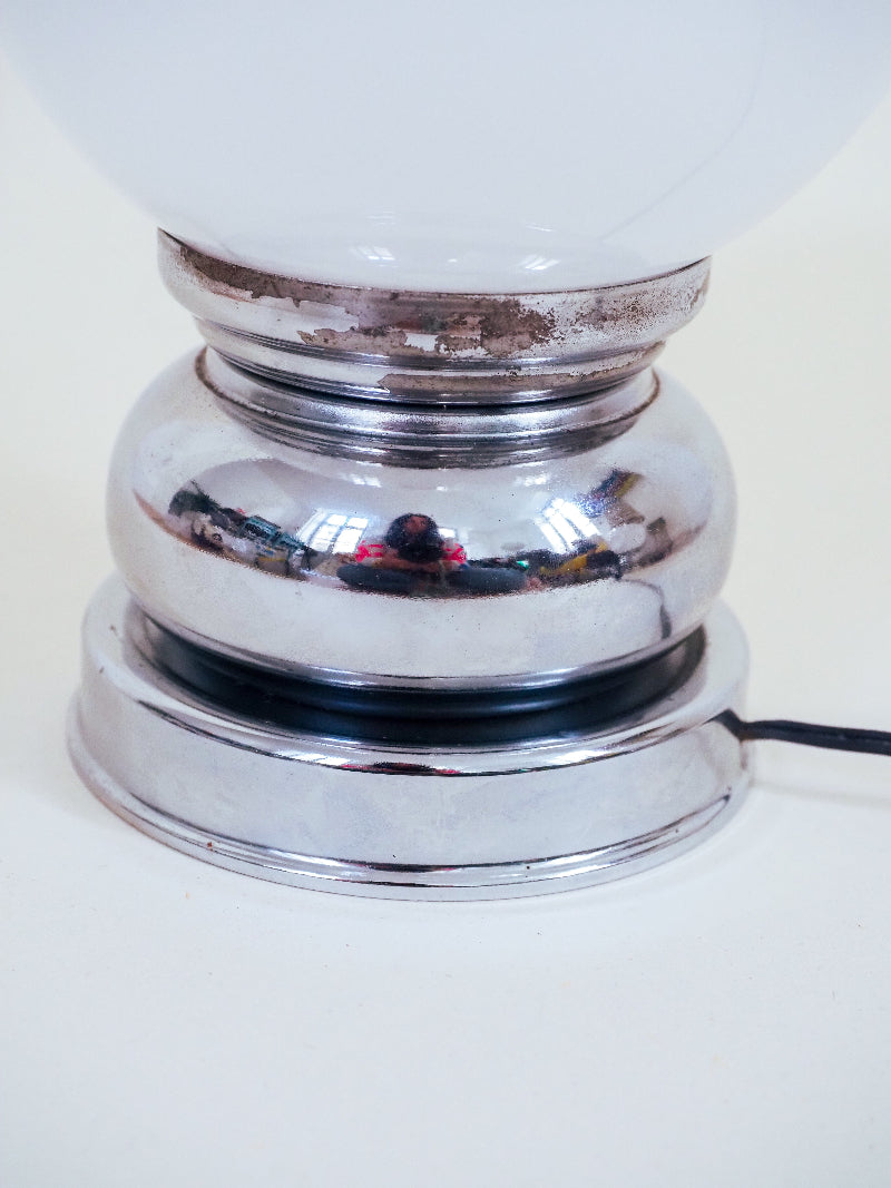 Socle en métal chromé (à noter : l’un des deux présente un chrome plus piqué au niveau du haut (sous le verre - voir photos) – se camoufle facilement en tournant la lampe)