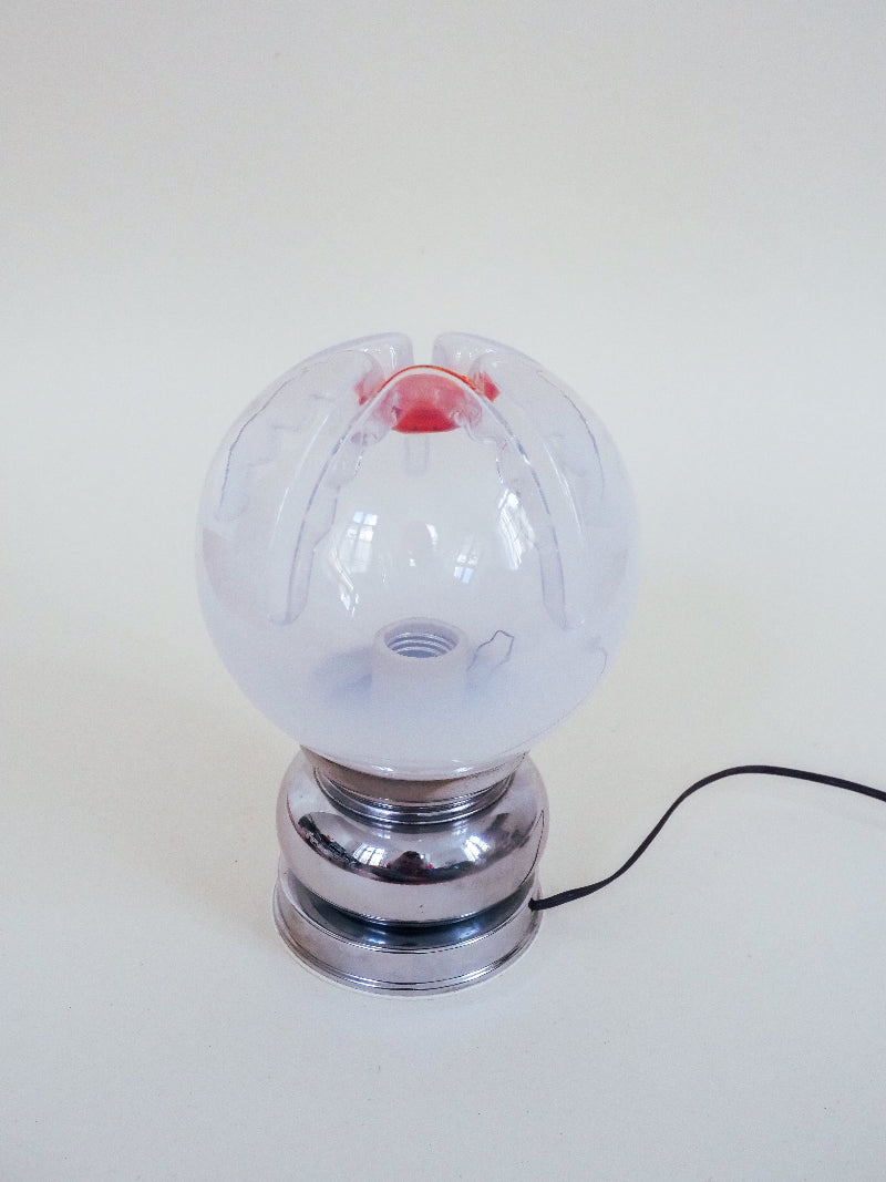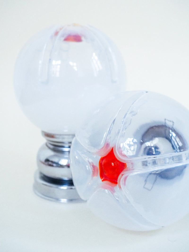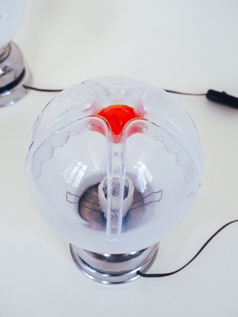 Sublime paire de lampes à poser vintage signée Mazzega, grande maison italienne de verrerie, active depuis le milieu du XXe siècle et reconnue pour ses collaborations avec des designers de renom. Ces appliques datent des années 1970 et incarnent parfaitement l’esthétique Space Age.