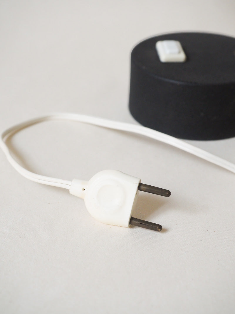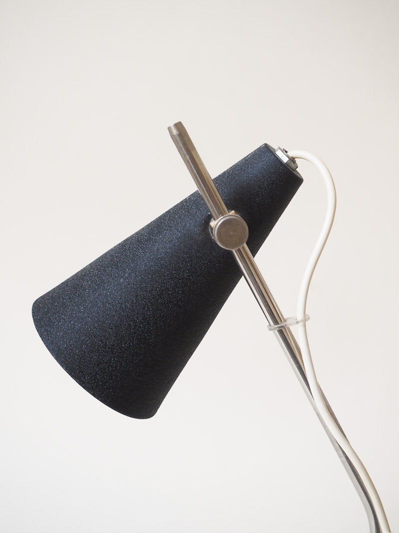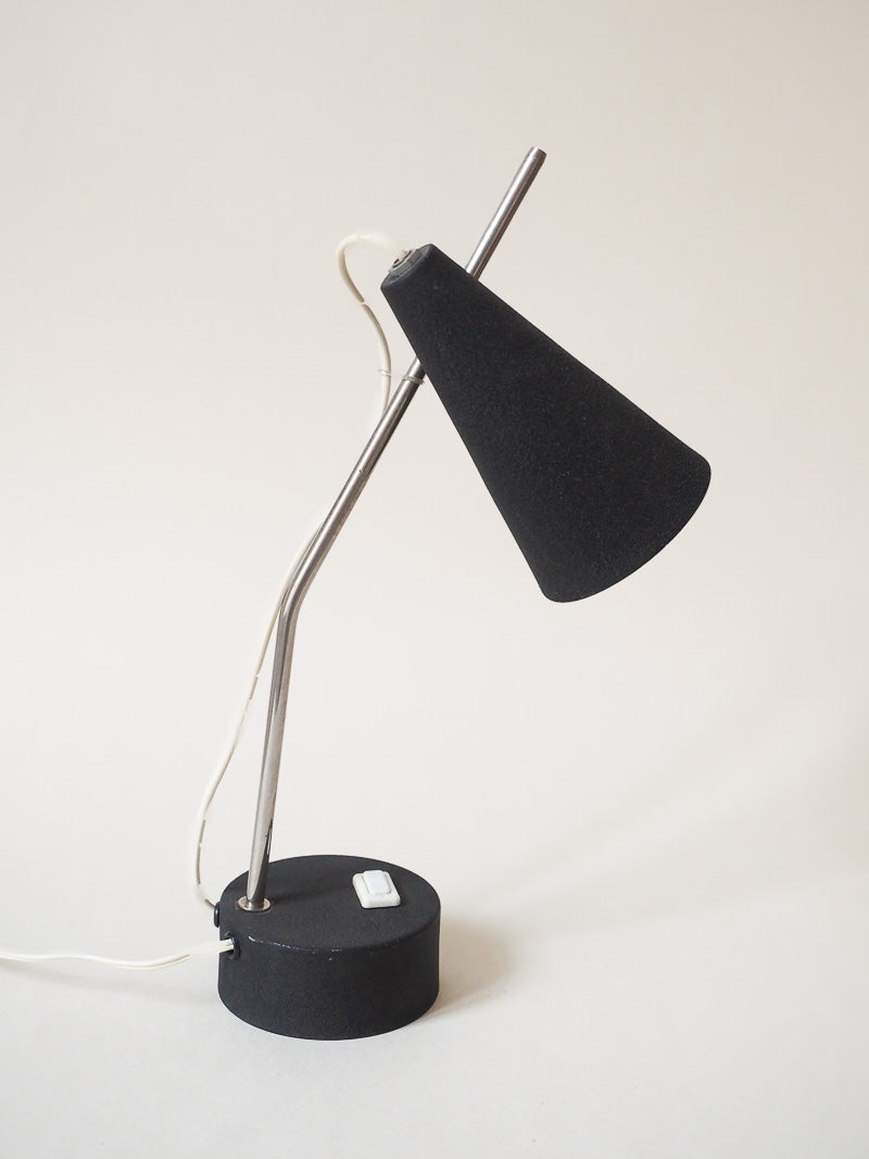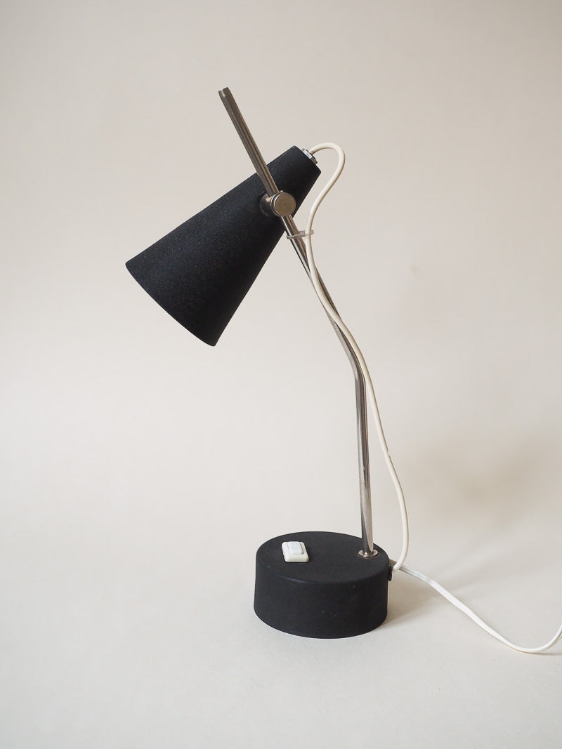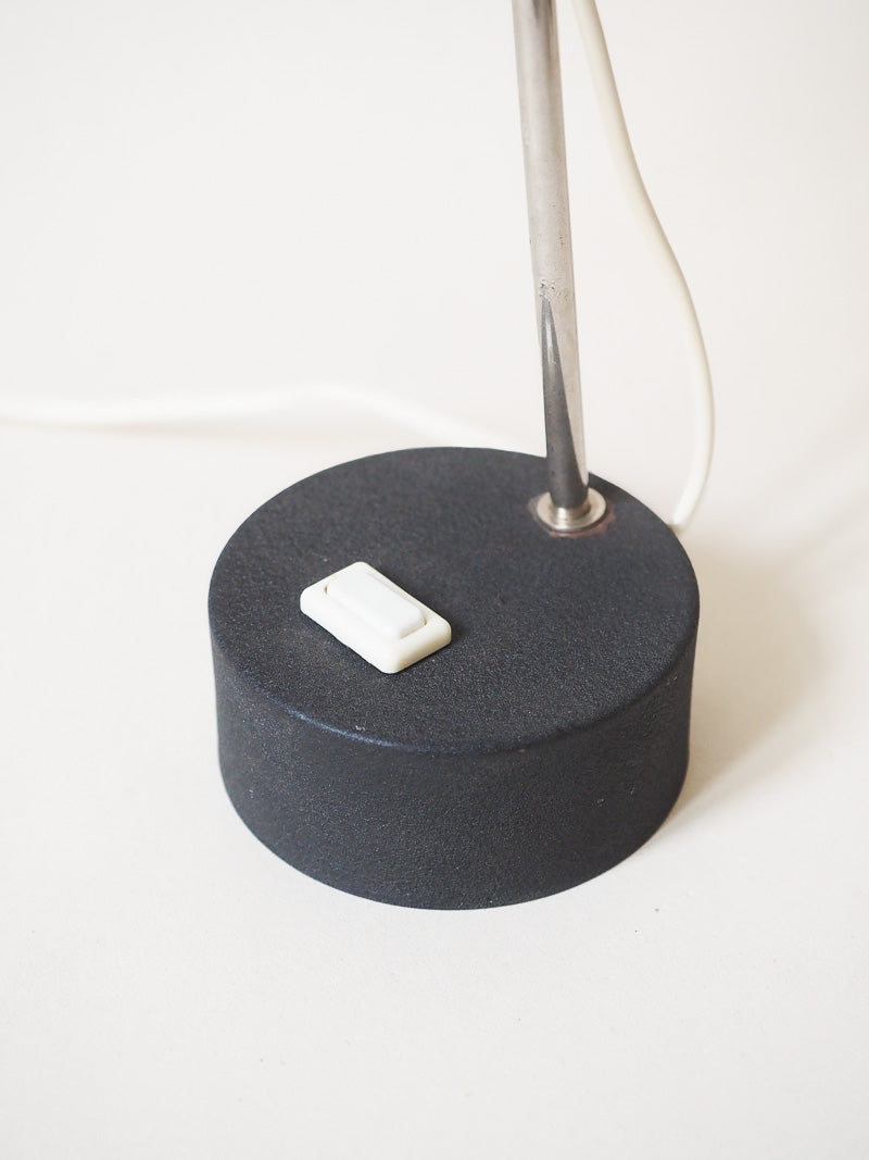 Constituée d’un épais socle cylindrique intégrant un interrupteur “façon frigo”, cette lampe en métal peint noir mat légèrement granuleux est dotée d’une tige courbée sur laquelle coulisse un spot orientable monté sur rotule.