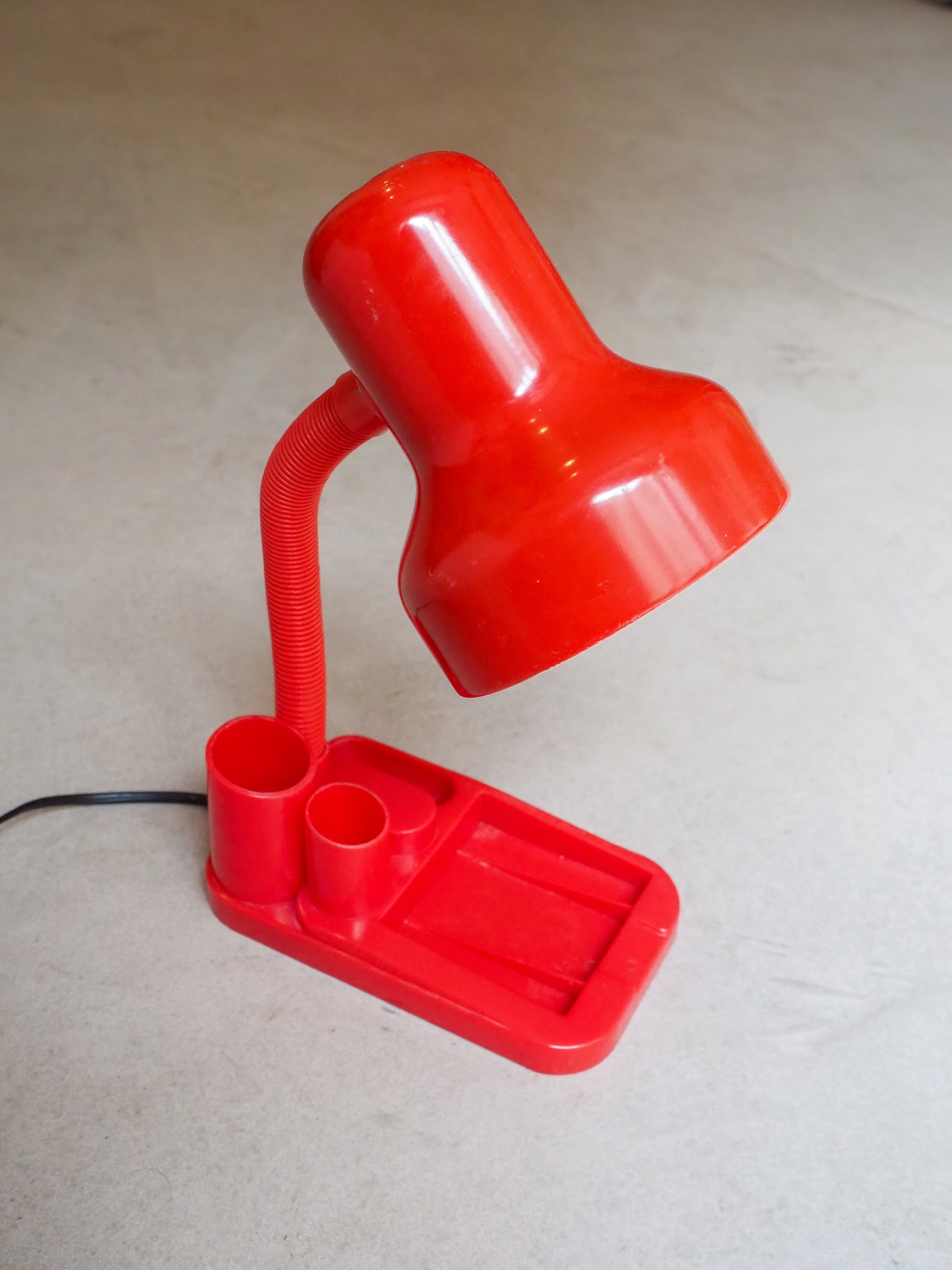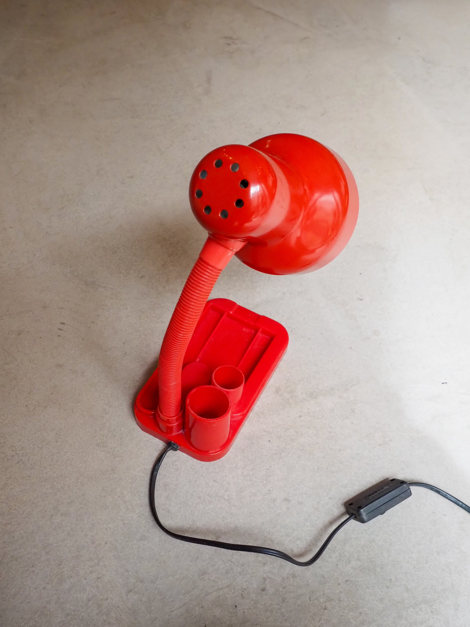 Lampe de bureau vintage rouge de la marque Seylumiere en très bon état des années 80. Son socle est compartimenté pour servir d'organisateur de bureau. Sa tige est flexible et permet d'orienter la lampe de gauche à droite et de haut en bas.