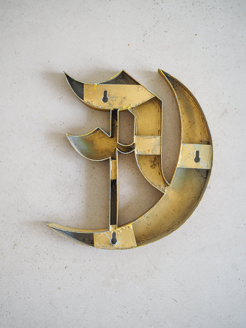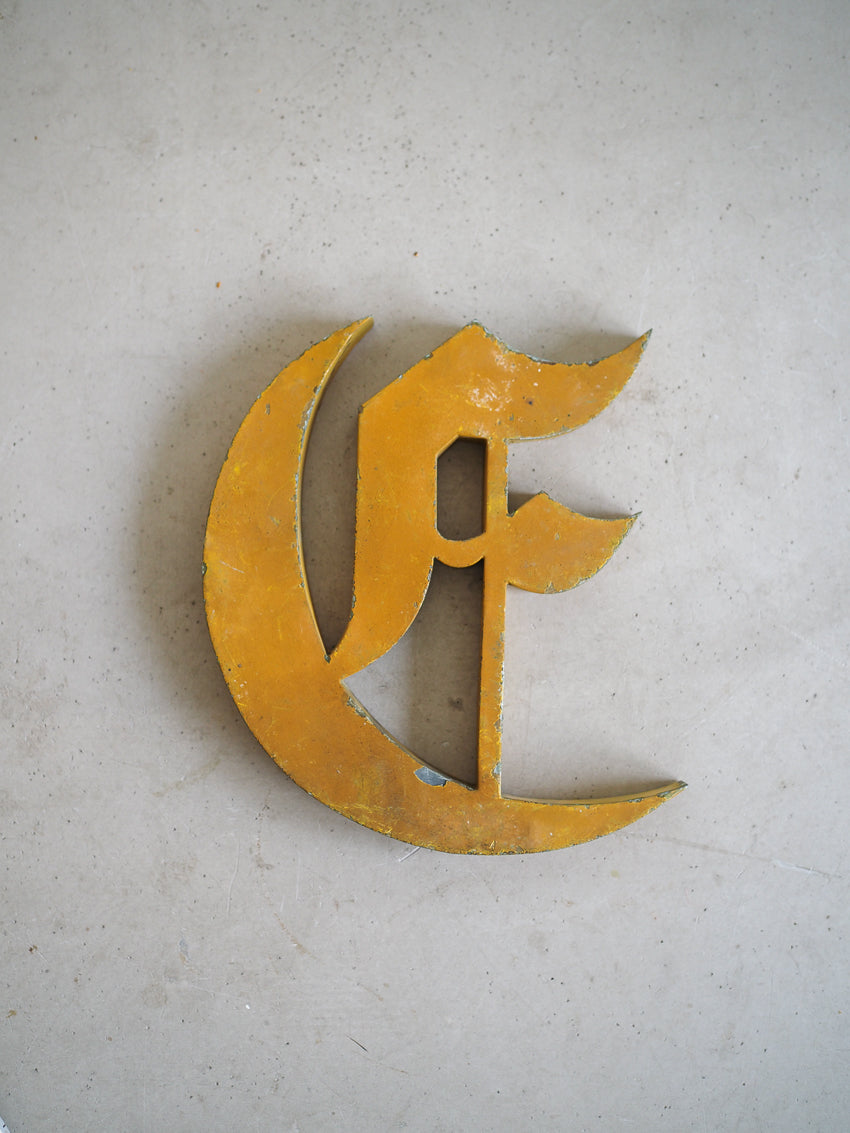 Très belle lettre d'enseigne en métal ancienne représentant la lettre E avec une typographie de style gothique.