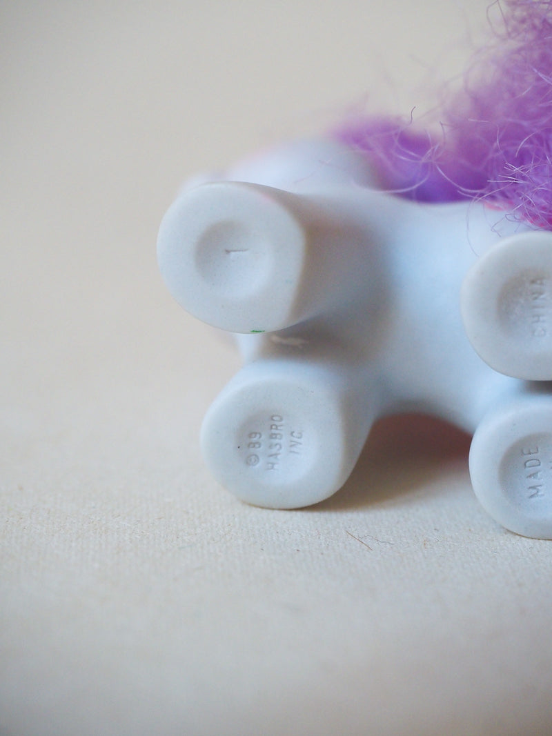 De petites marques légères (en cohérence avec âge vintage) peuvent subsister malgré un nettoyage méticuleux. Ces poneys sont en bon état. À noter : la crinière et la queue du bébé violet restent indomptés !