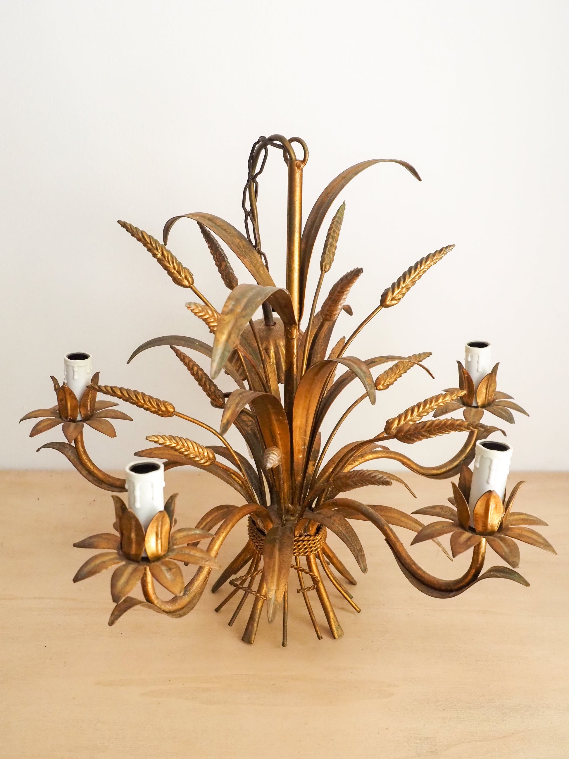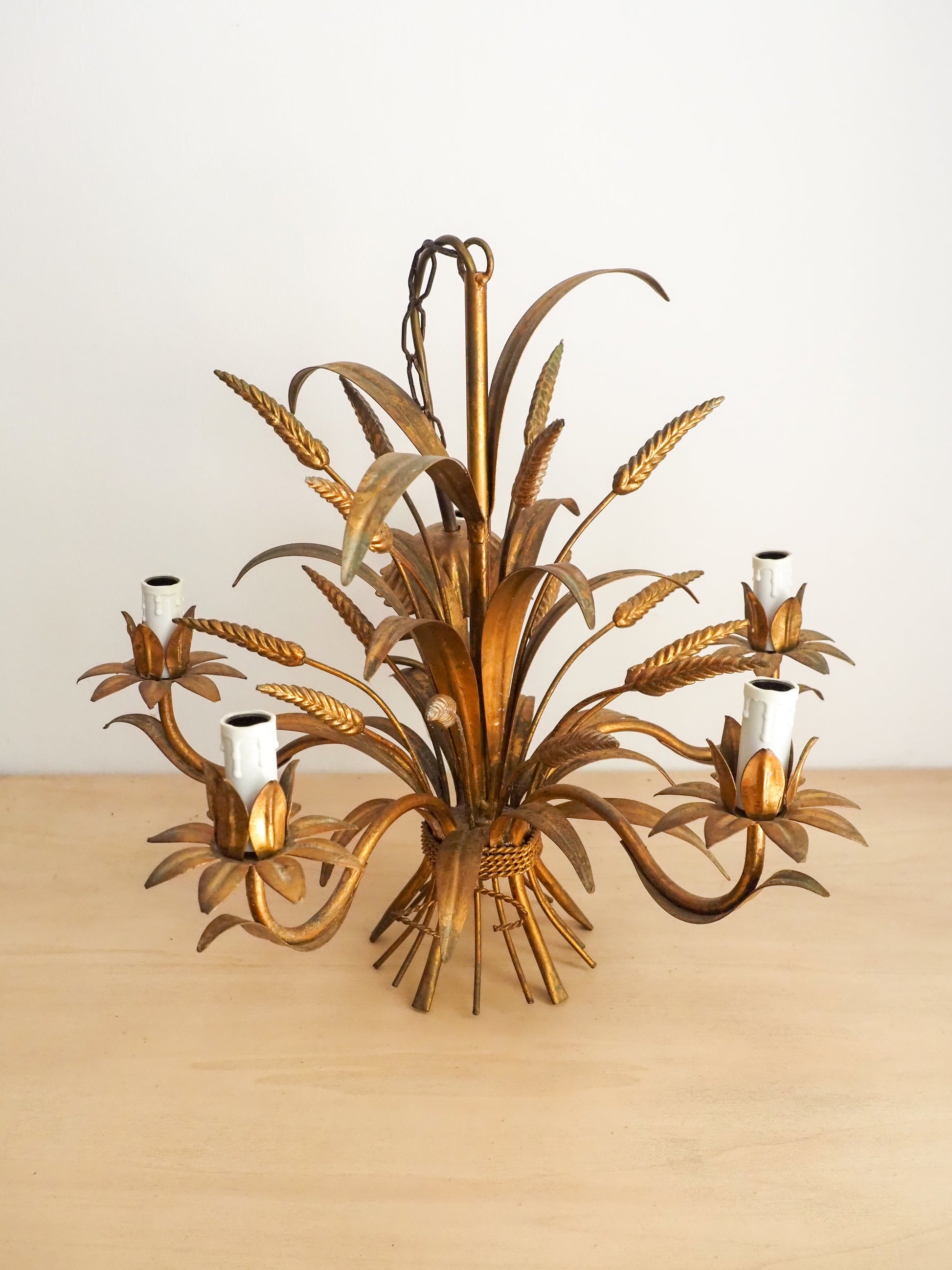 Ce lustre imposant en métal doré dans le style du designer allemand Hans Kögl, est décoré de "gerbe de blé" ou "épis de maïs". Il se distingue par 5 branches sculptées et son allure baroque chic.