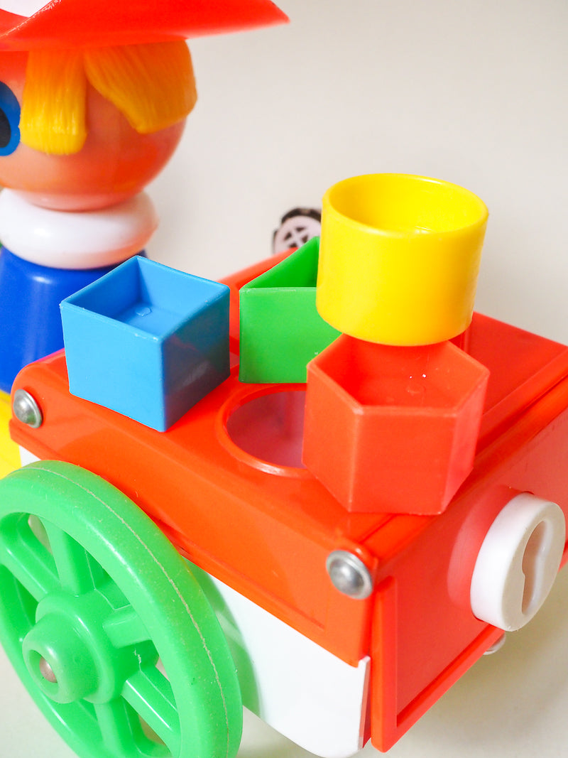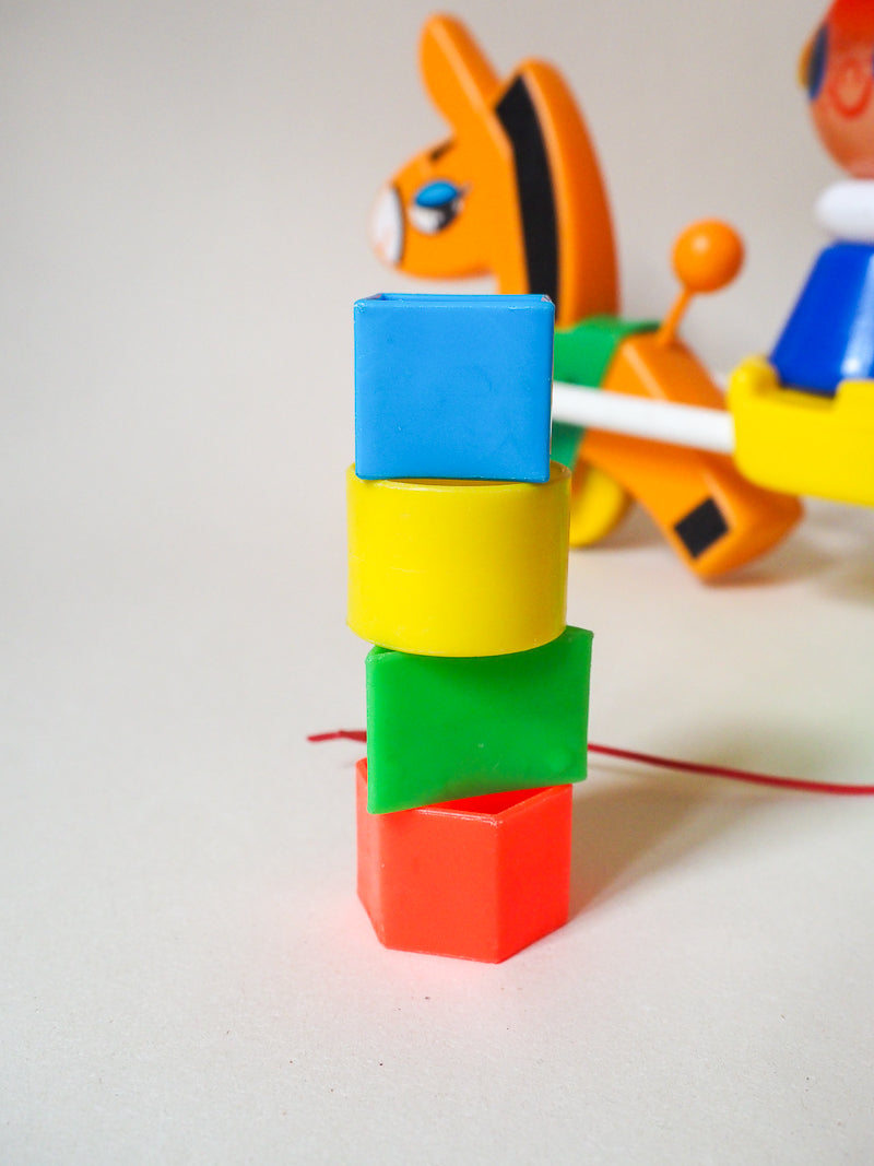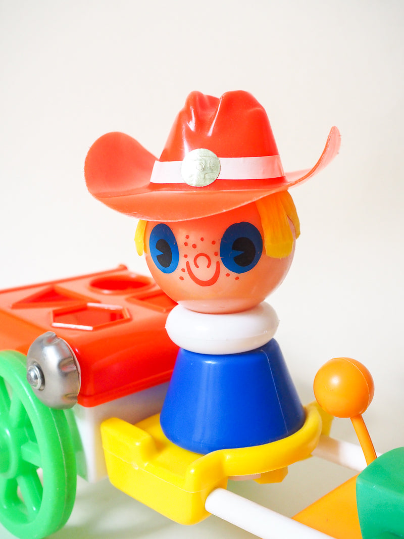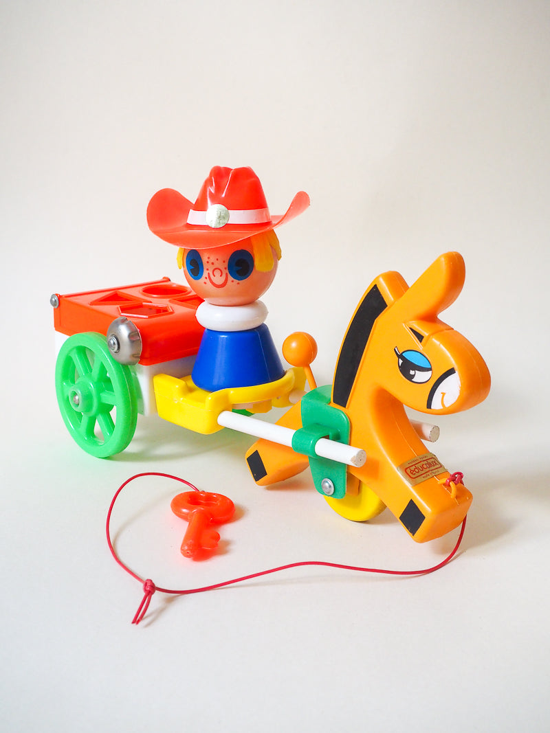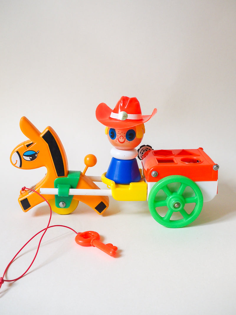 Ce jouet à tirer représente un Fermier ou un Cow-Boy assis dans une charette et tiré par un cheval. C'est aussi bien un jeu éducatif qu'un bel objet de décoration. La charrette est un jeu de formes, où l’enfant peut faire passer 4 formes différentes.