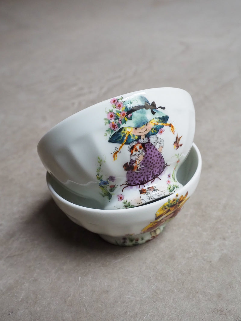 Adorables mini bols en porcelaine de Limoges qui s'inscrivent dans un univers doux et nostalgique, évoquant le style Sarah Kay : scènes enfantines, tenues rétro, et un esprit poétique. Collection Francis Quinque.