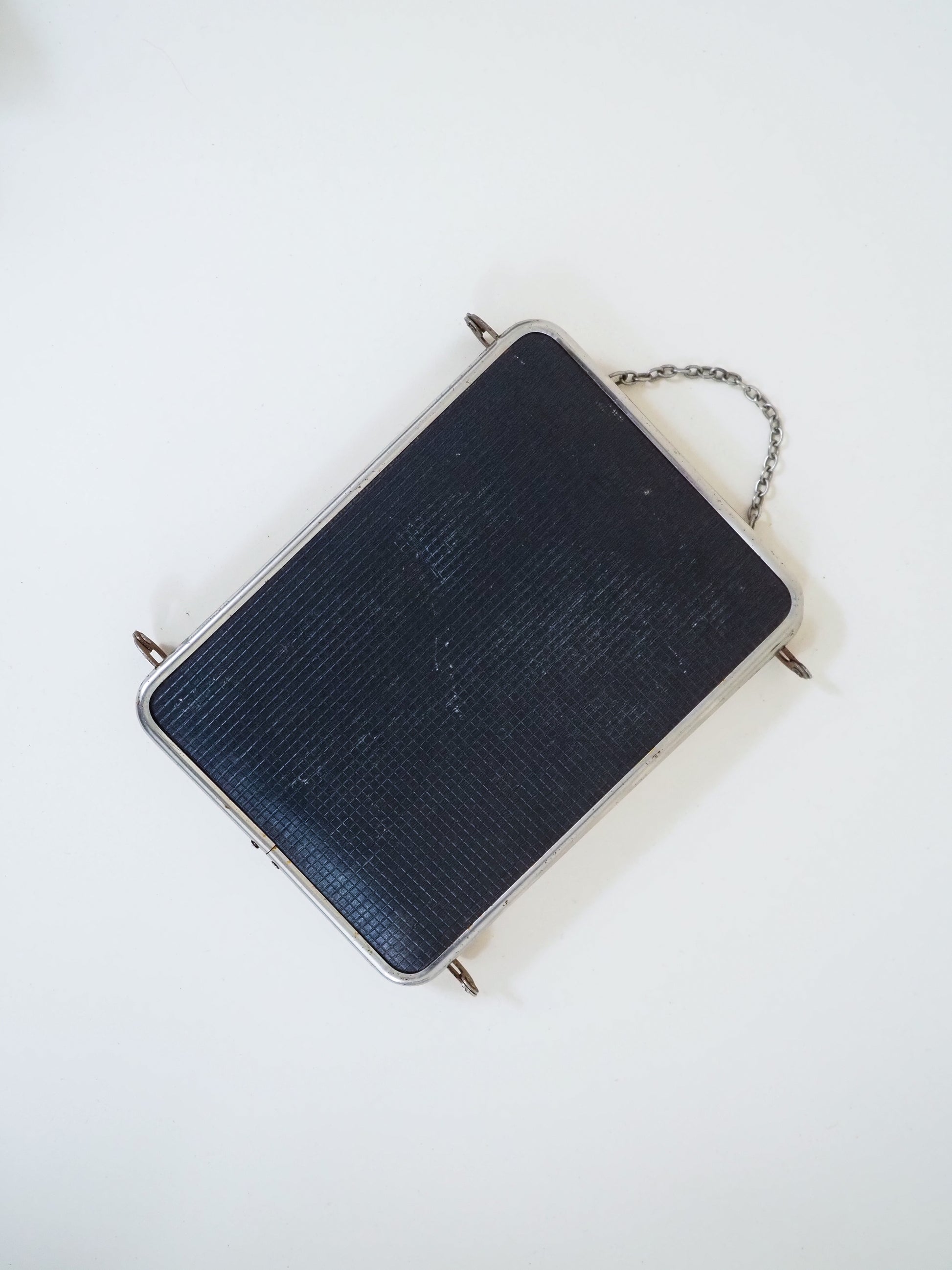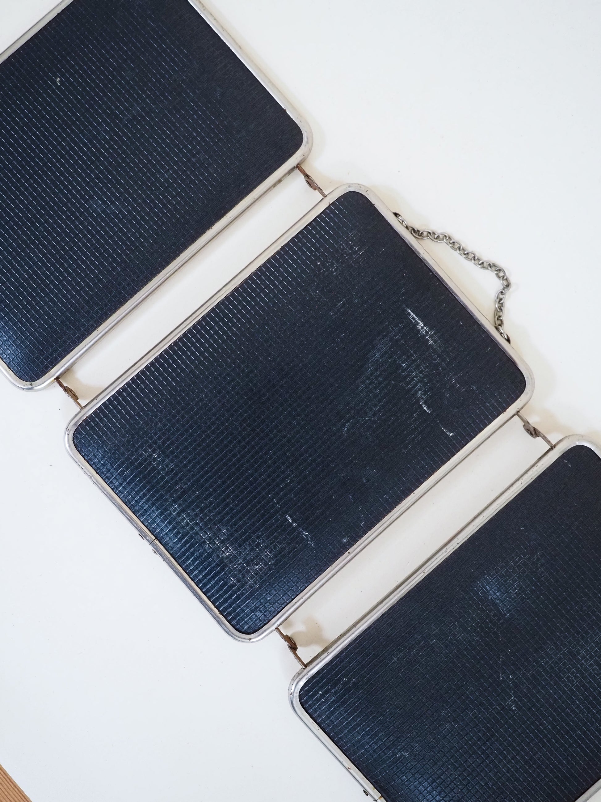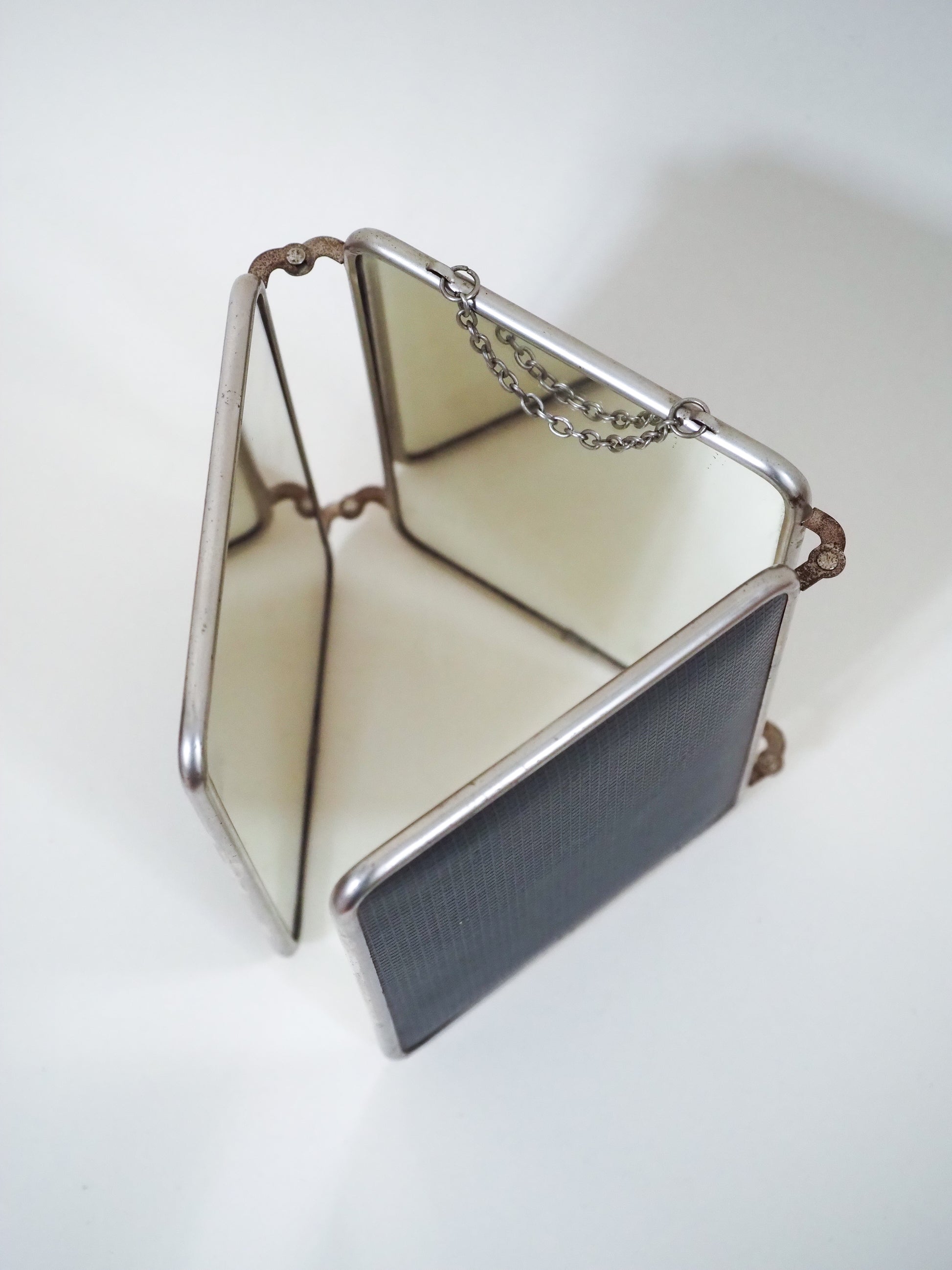 Miroir de barbier - triptyque. En très bon état, avec sa chainette pour être accroché au mur. Chaque miroir est articulé pour être replié sur le miroir central.