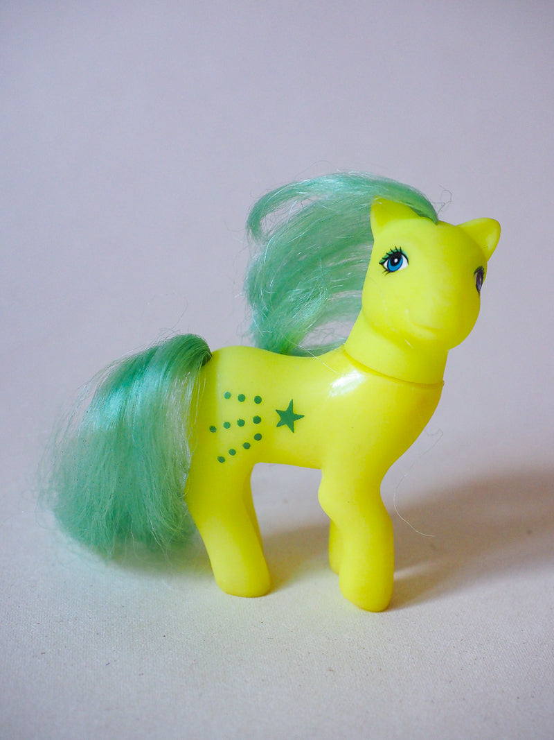 Lot de deux bébés poneys inspirés des My little pony de la marque Hasbro. Il s'agit ici d'une copie vintage. Un duo fluo jaune et rose fluo en très bon état.