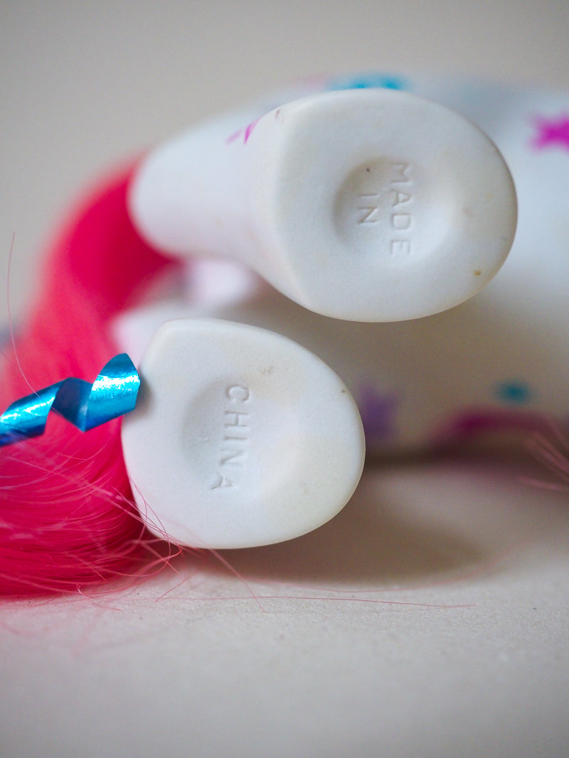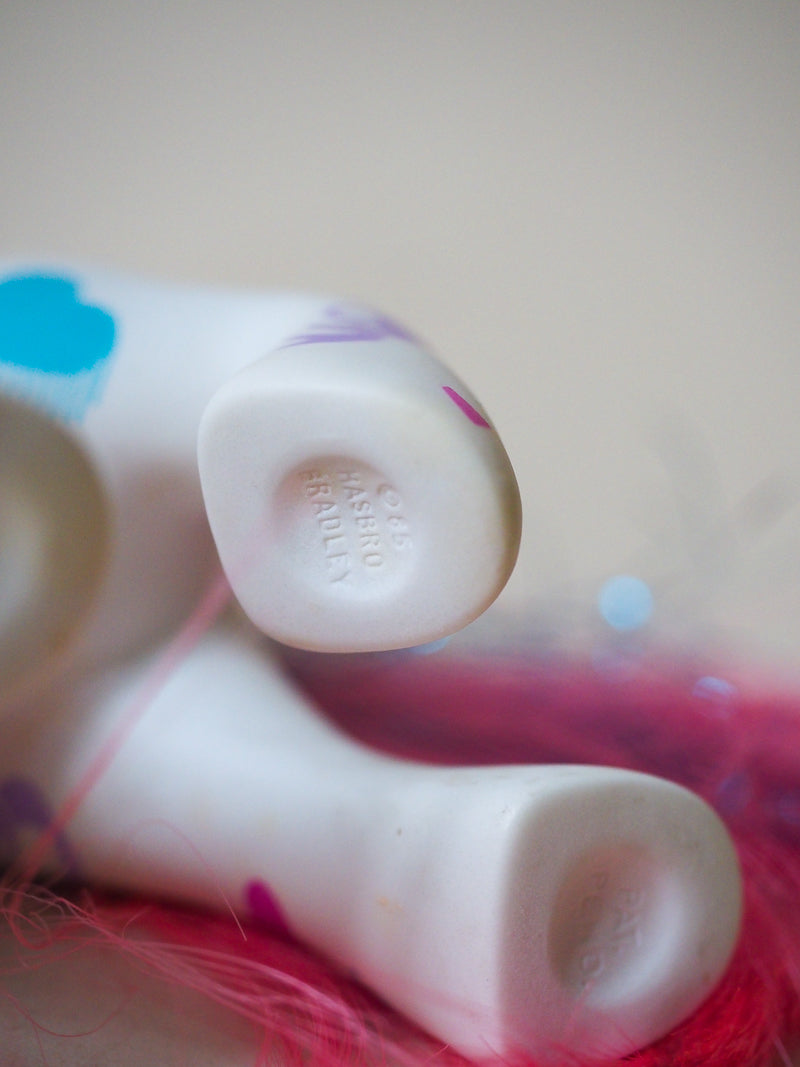 Ce petit poney Anniversaire fait partie des premiers Petits Poney édités par Hasbro. Un vrai jouet vintage collector. C'est un modèle rare avec les morceaux de bolducs qui constituent sa queue.