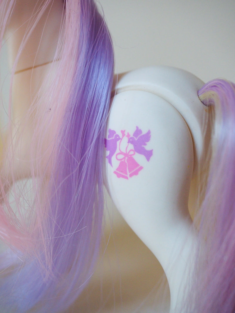 Ce petit poney fait partie de la deuxième génération Mon Petit Poney. Il est dans un très bel état de conservation. Particularité : ses pattes arrières sont articulées, il faisait partie du set Romantica la Mariée et sa Chapelle.