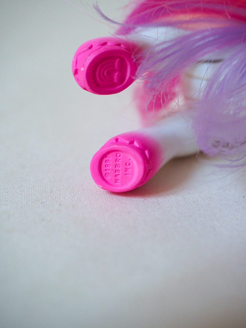 Ce petit poney fait partie de la deuxième génération Mon Petit Poney. Il est dans un très bel état de conservation. Particularité : il est en plastique dur, il faisait partie du set Canopy Bed with Light Heart.