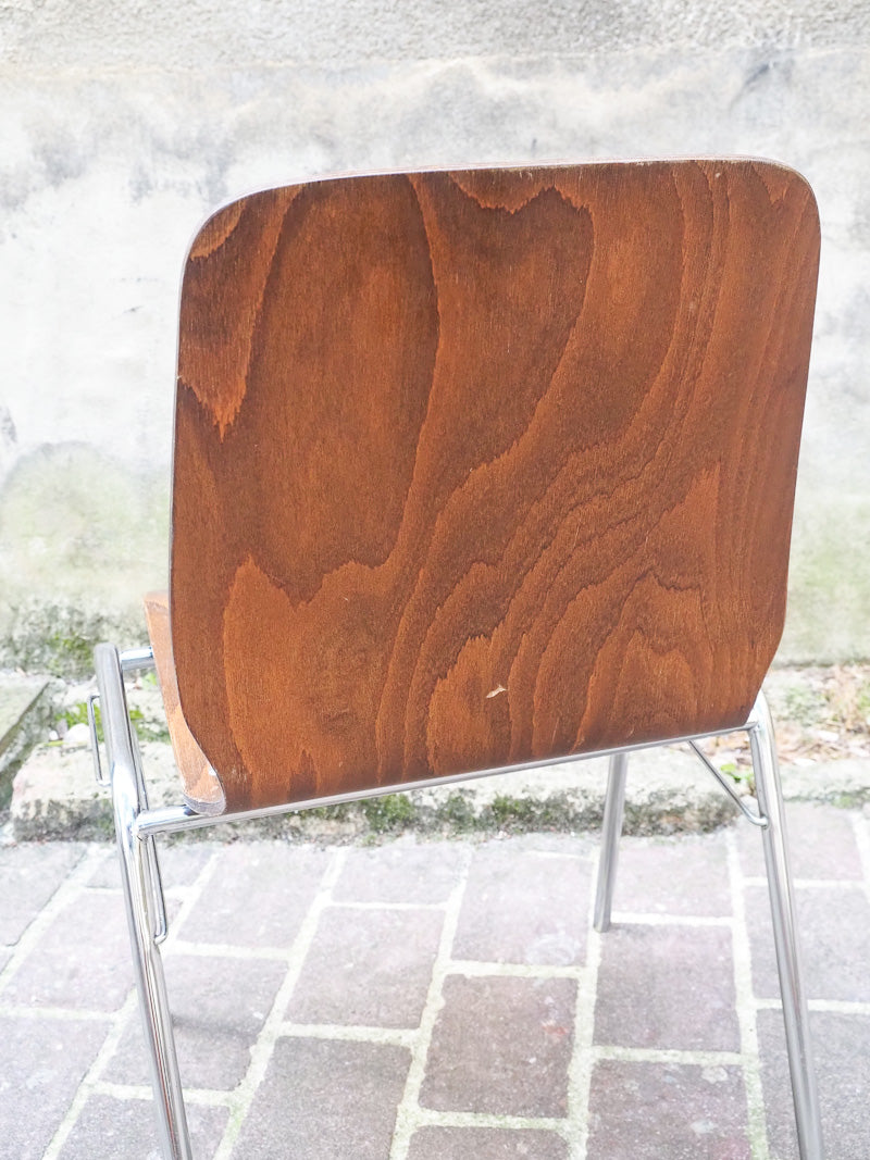Superbe paire de chaises de style moderniste / conférence, datant des années 1960–1970. Design épuré, typique de l’époque, alliant piètement tubulaire en acier chromé et assise & dossier en Pagholz (bois lamellé-collé cintré). Pièces authentiques vintage.