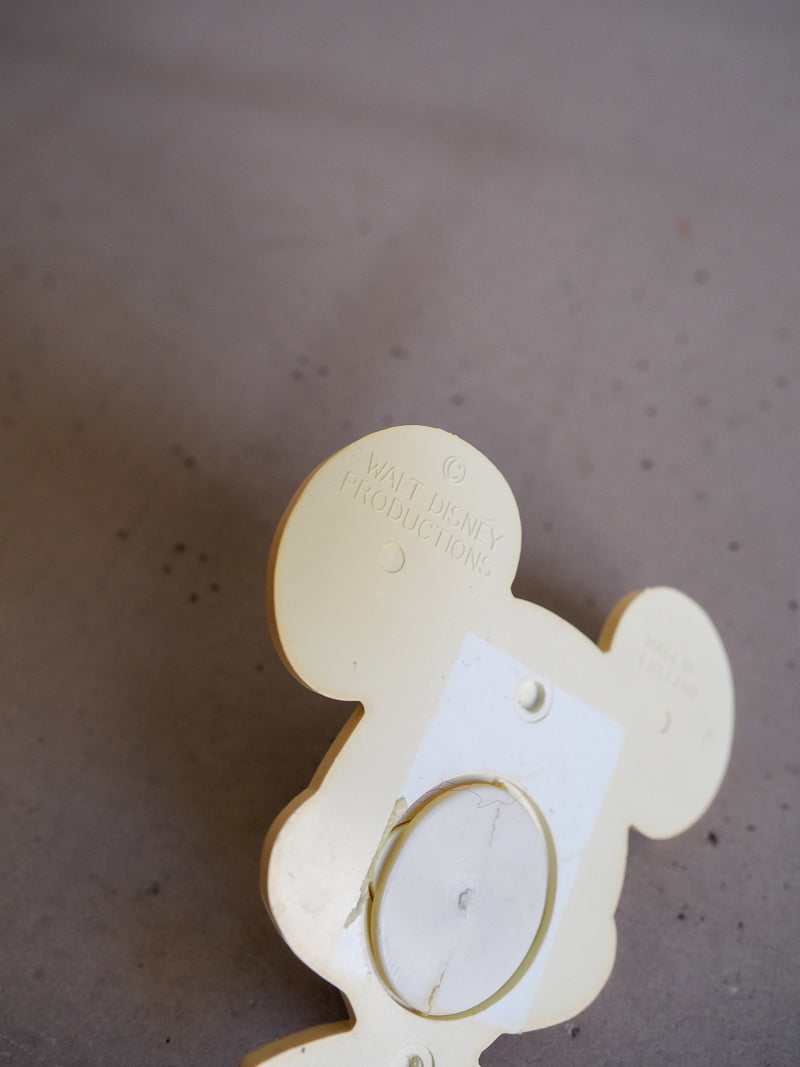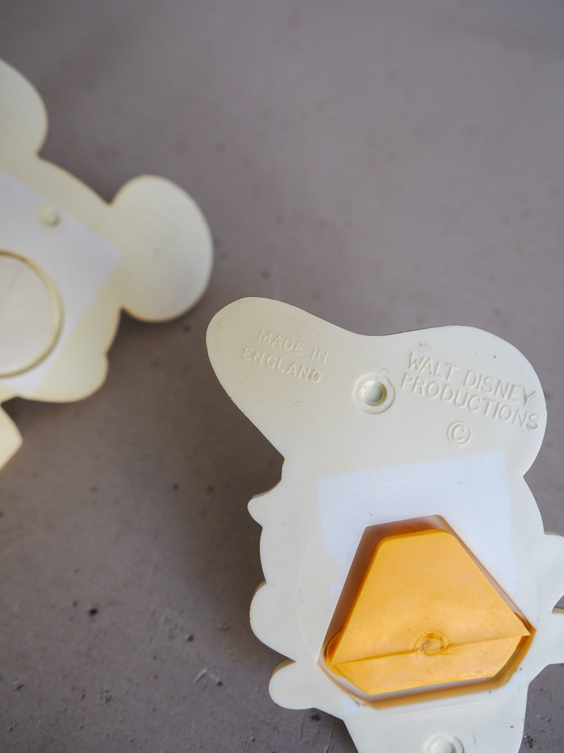 Voici 2 patères en forme de Donald et Mickey qui se fixent avec un autocollant double face (non fourni). Le bec et le museau servent de crochets pour accrocher des petites affaires. Ils datent des années 70.