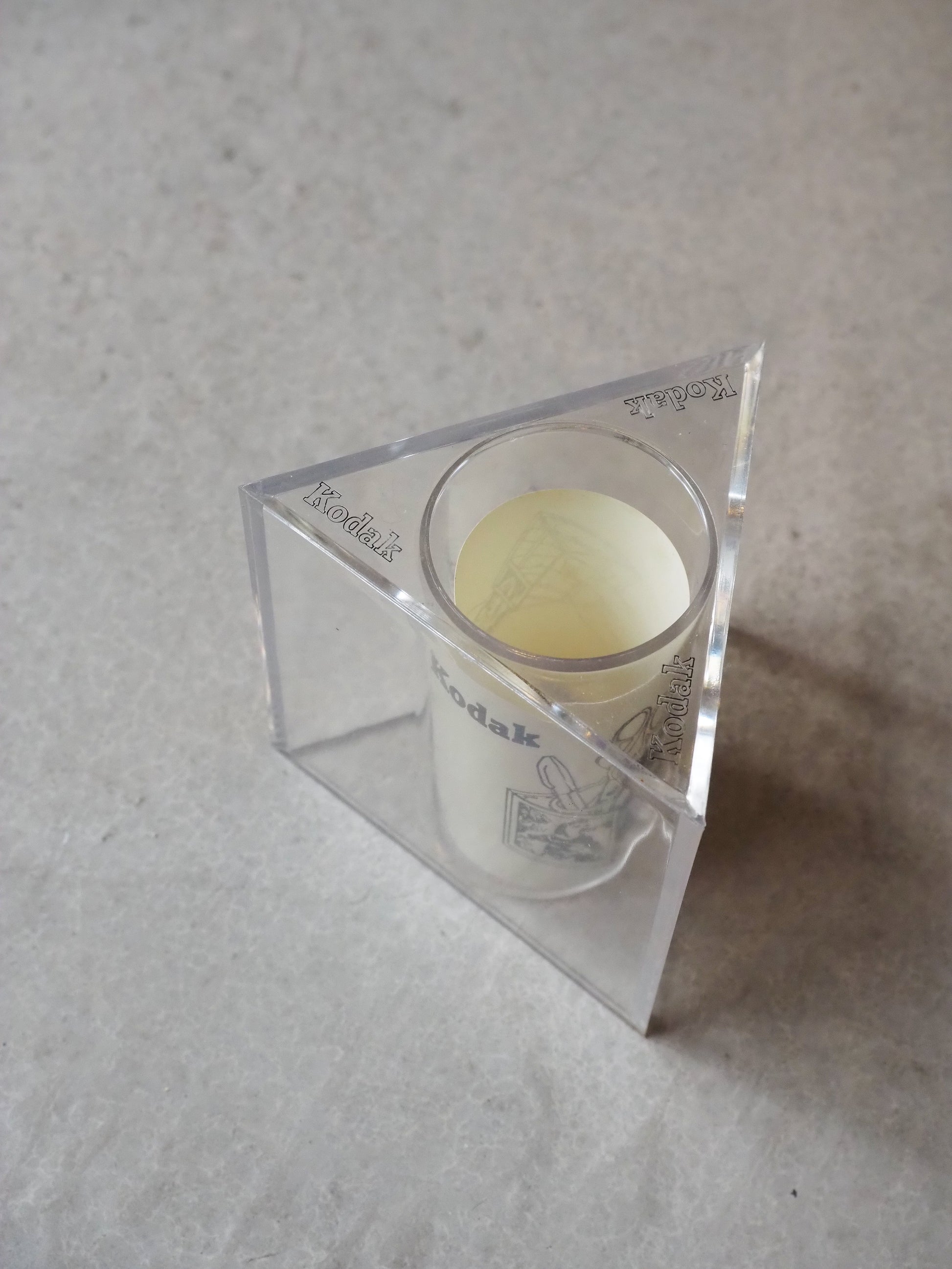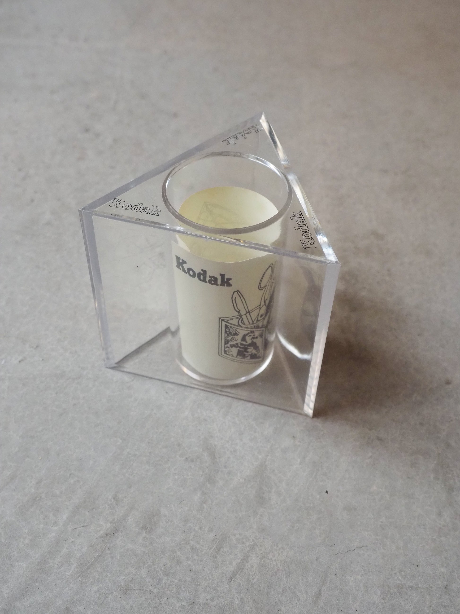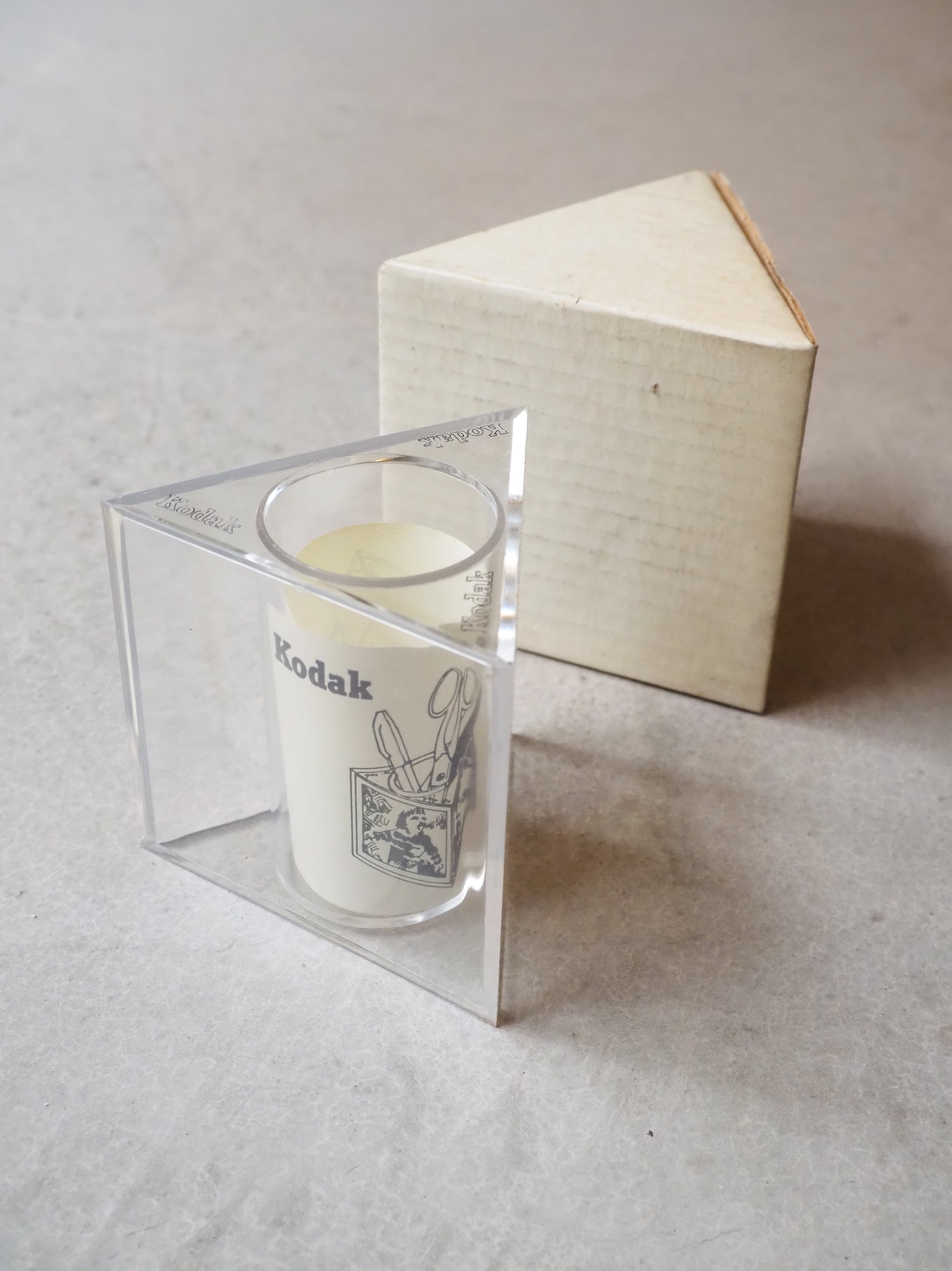 Vous connaissez le porte-photo cube des années 70 ? Voici la version prisme Kodak. Il s'agit d'un original porte-crayon triangulaire vintage en plastique transparent, un objet publicitaire de Kodak. Son design astucieux permet d’y glisser une photo ou une image roulée autour du tube à l’intérieur, le transformant en un accessoire personnalisable et unique. Issu d’un ancien stock d'objets neufs, il est parfait pour un bureau ou une collection d'objets vintage. Collector pour les collectionneurs d'objets Kodak, cet article est un véritable petit trésor à ne pas manquer.