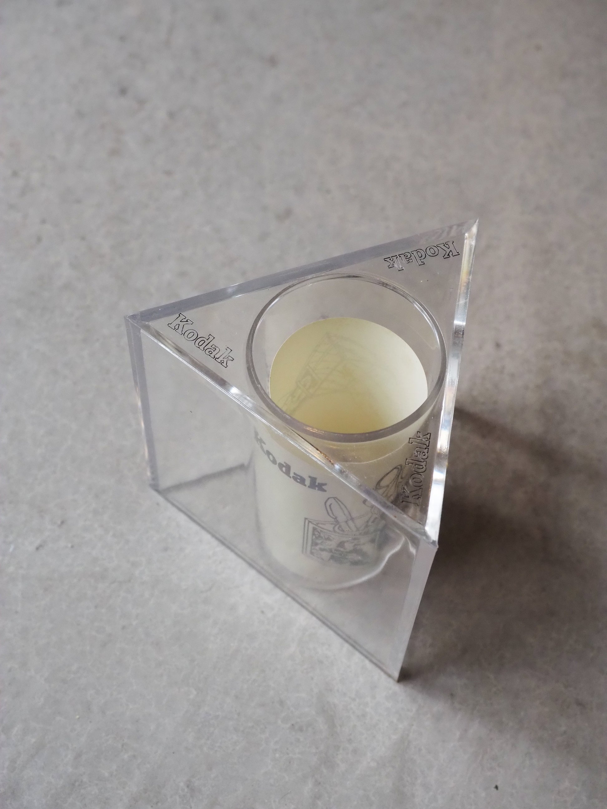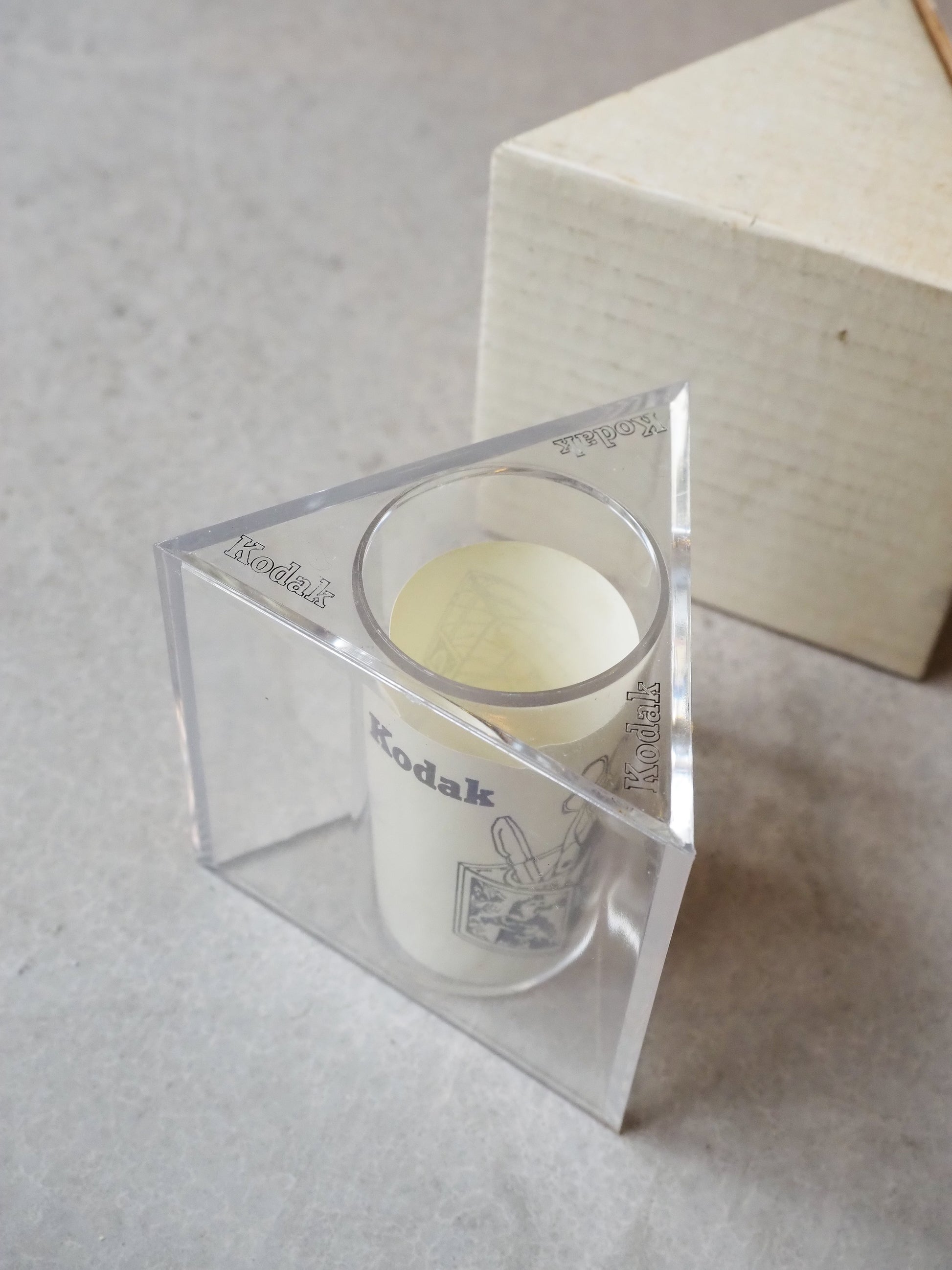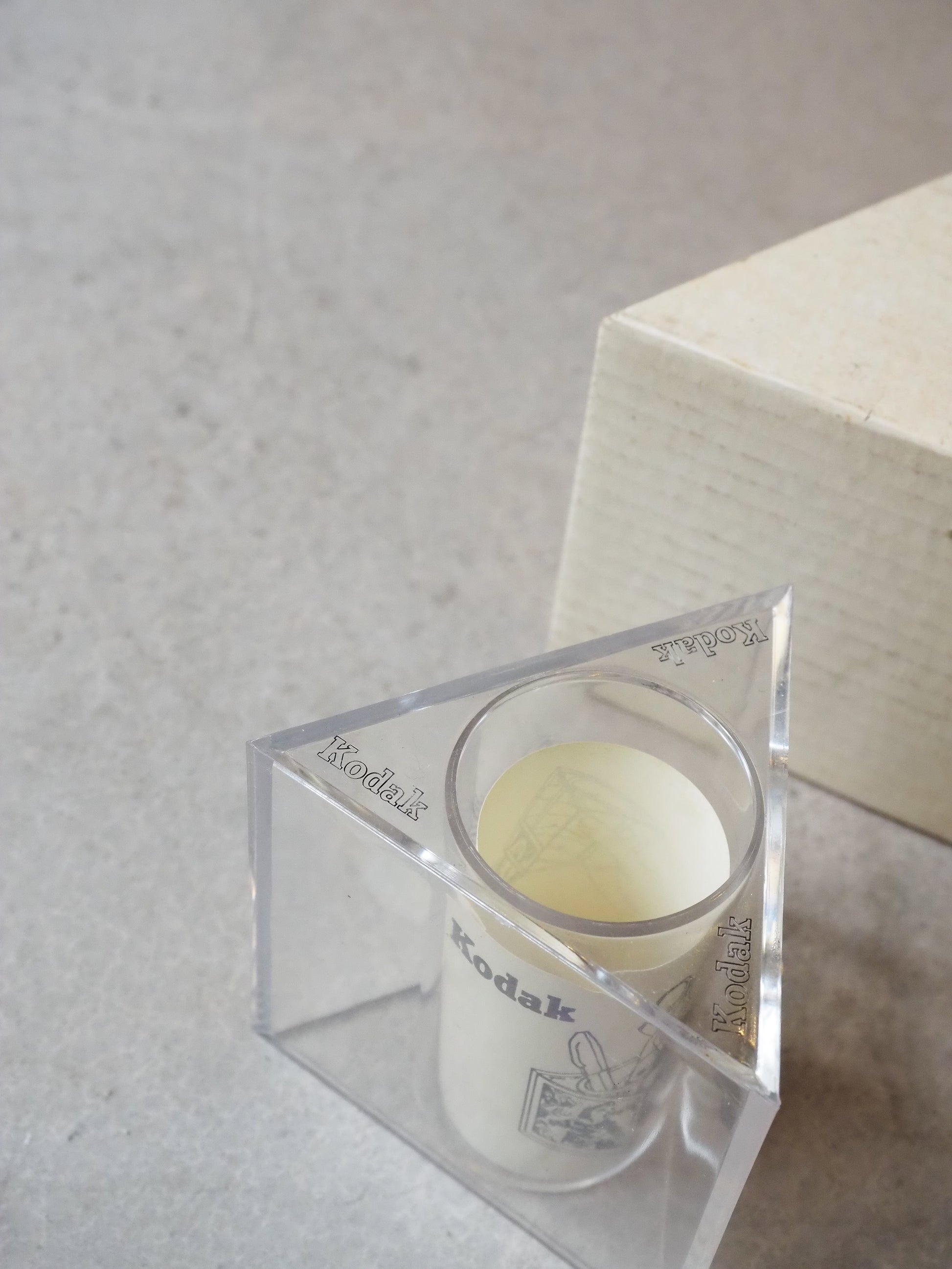 Vous connaissez le porte-photo cube des années 70 ? Voici la version prisme Kodak. Il s'agit d'un original porte-crayon triangulaire vintage en plastique transparent, un objet publicitaire de Kodak. Son design astucieux permet d’y glisser une photo ou une image roulée autour du tube à l’intérieur, le transformant en un accessoire personnalisable et unique. Issu d’un ancien stock d'objets neufs, il est parfait pour un bureau ou une collection d'objets vintage. Collector pour les collectionneurs d'objets Kodak, cet article est un véritable petit trésor à ne pas manquer.