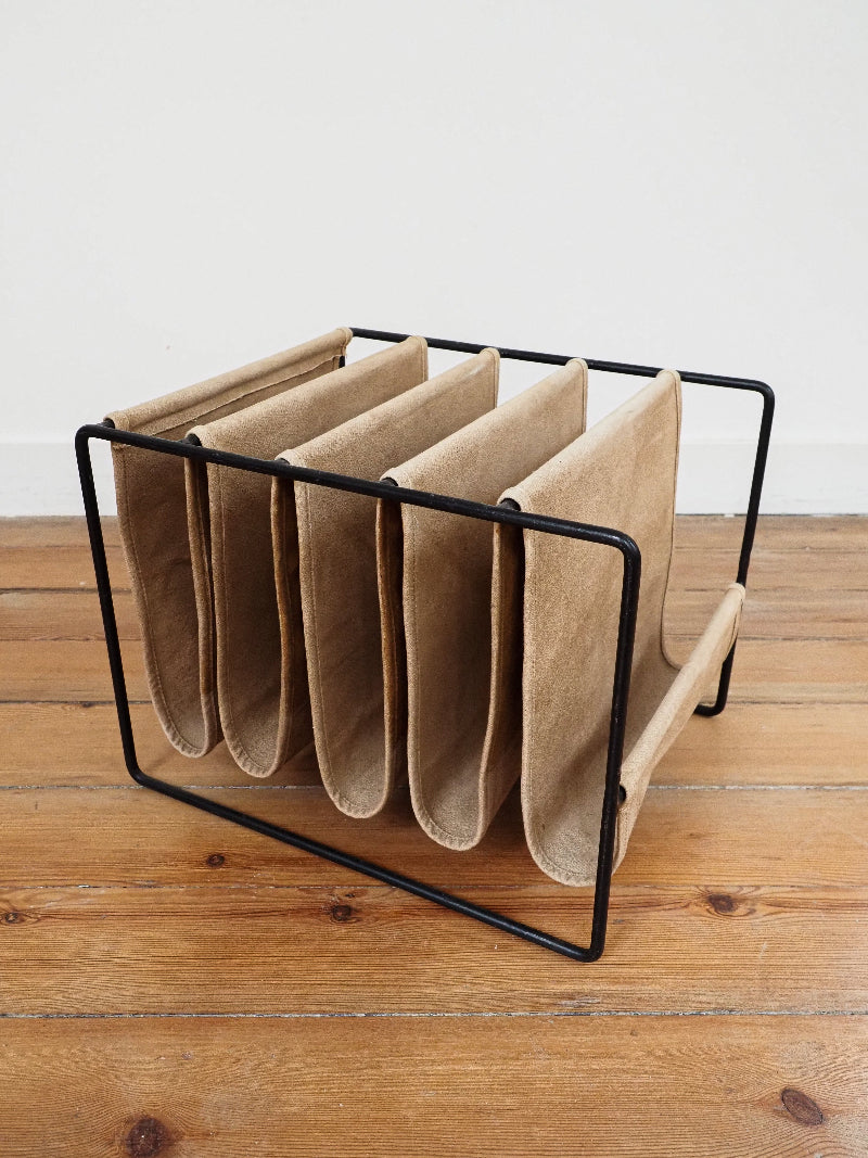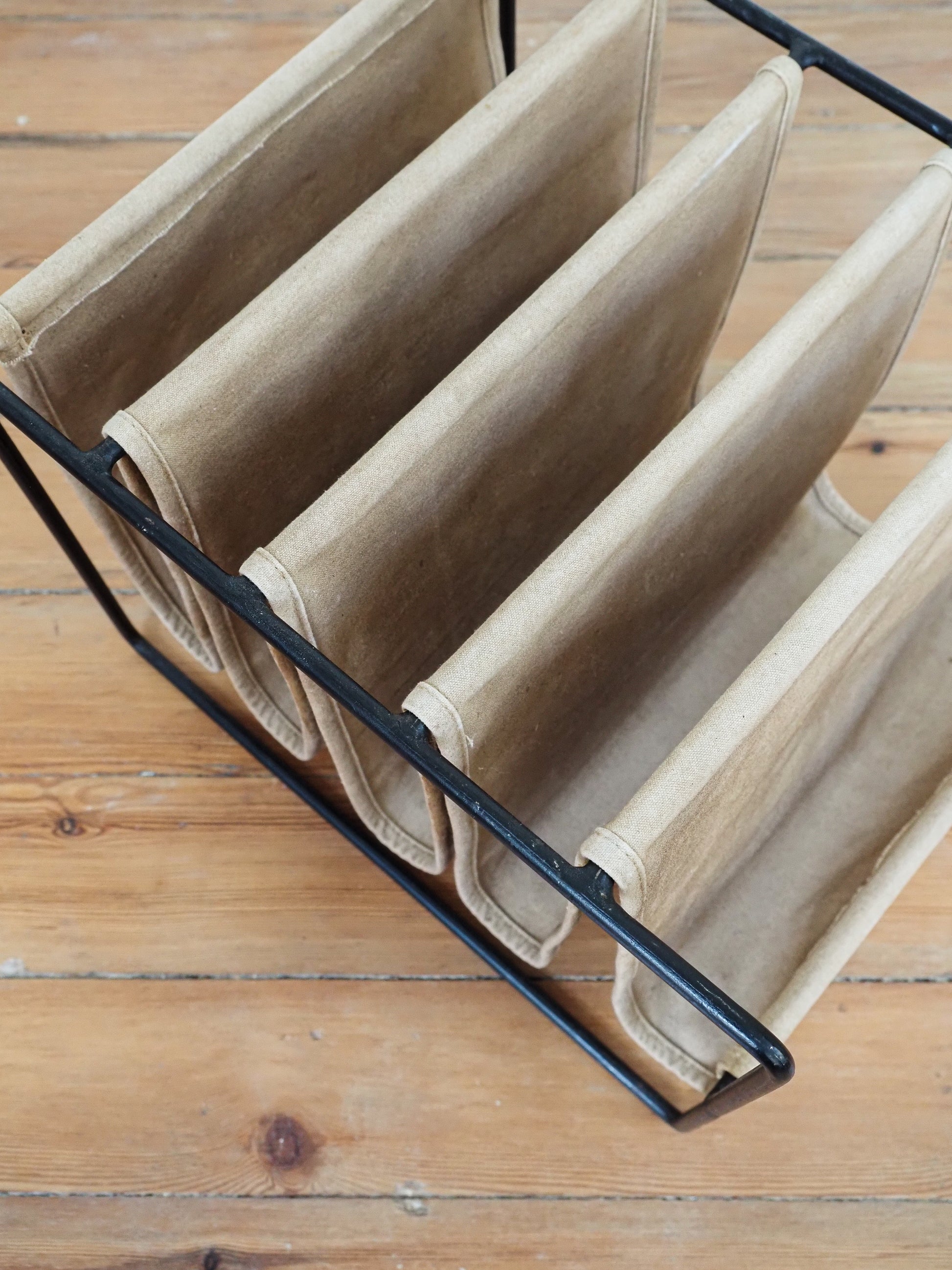 Élégant et fonctionnel, ce porte-revues est constitué d'une structure en métal lourde, associée à cinq compartiments réalisés en toile tendue. Dans un style années 60, il est parfait pour organiser magazines, journaux ou documents.