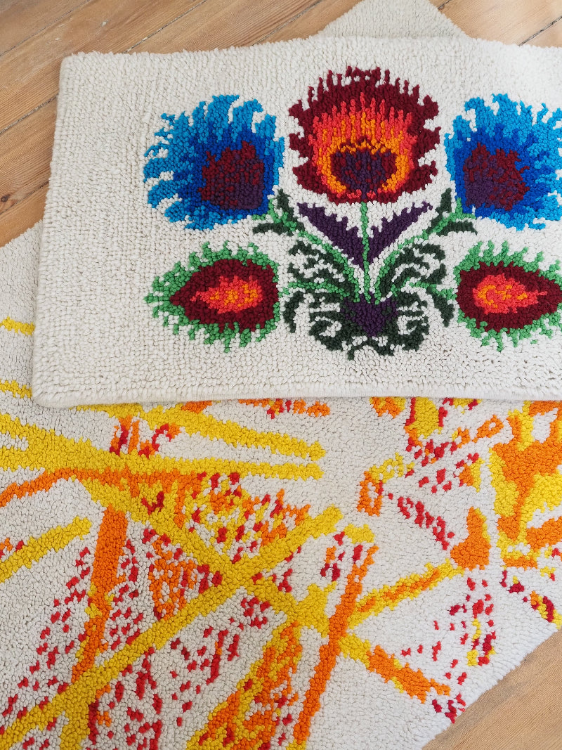 Tapis en laine tissée à la main, au fond crème, rehaussé d’un décor abstrait jaune orange et rouge très années 70. Lavé soigneusement à la main et en machine. Belles dimensions pour ce tapis qui sera très joli sous une table basse dans une décoration vintage ou éclectique.