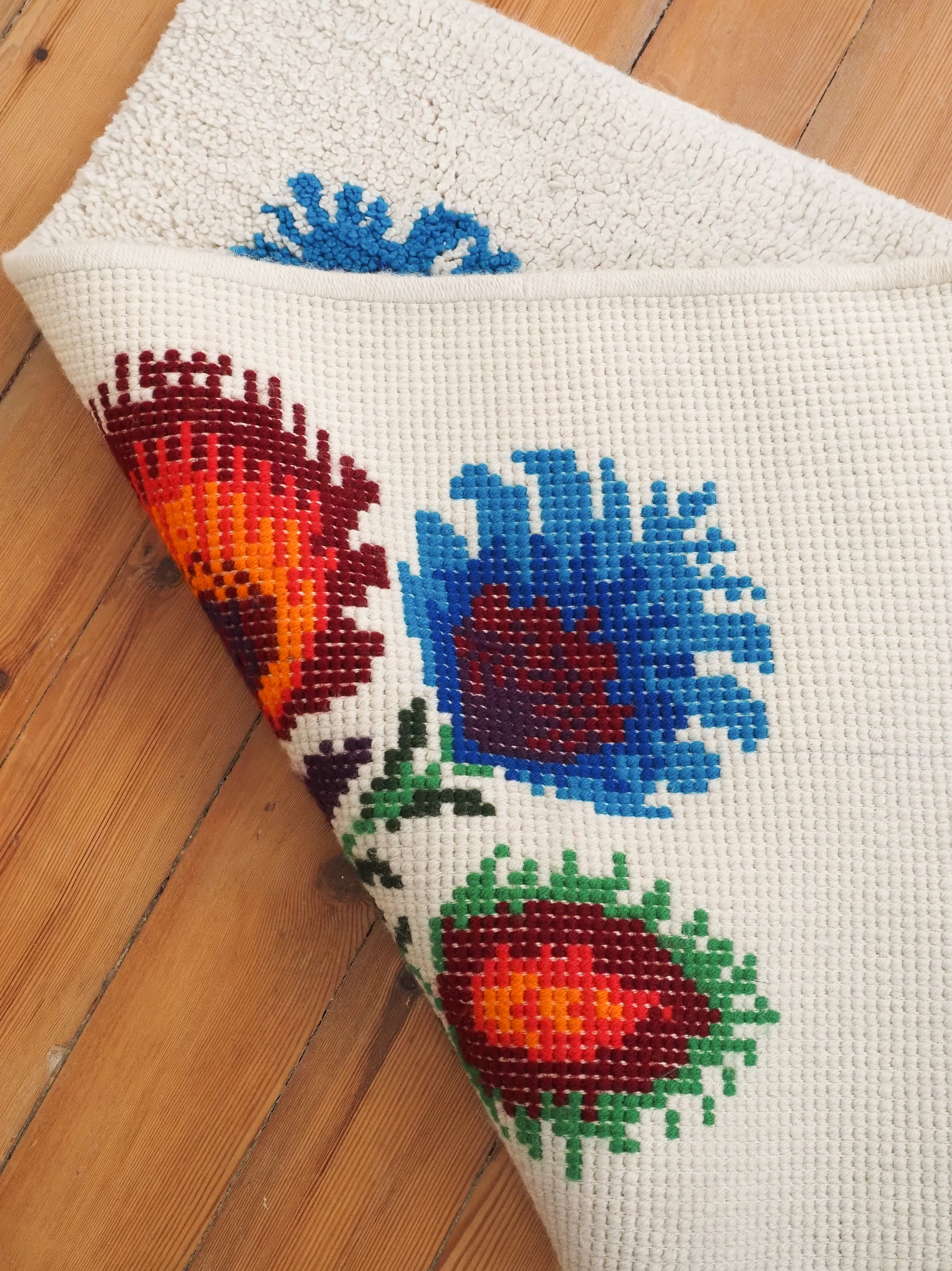 Tapis en laine vintage fait main – fleurs – 100 x 60 cm