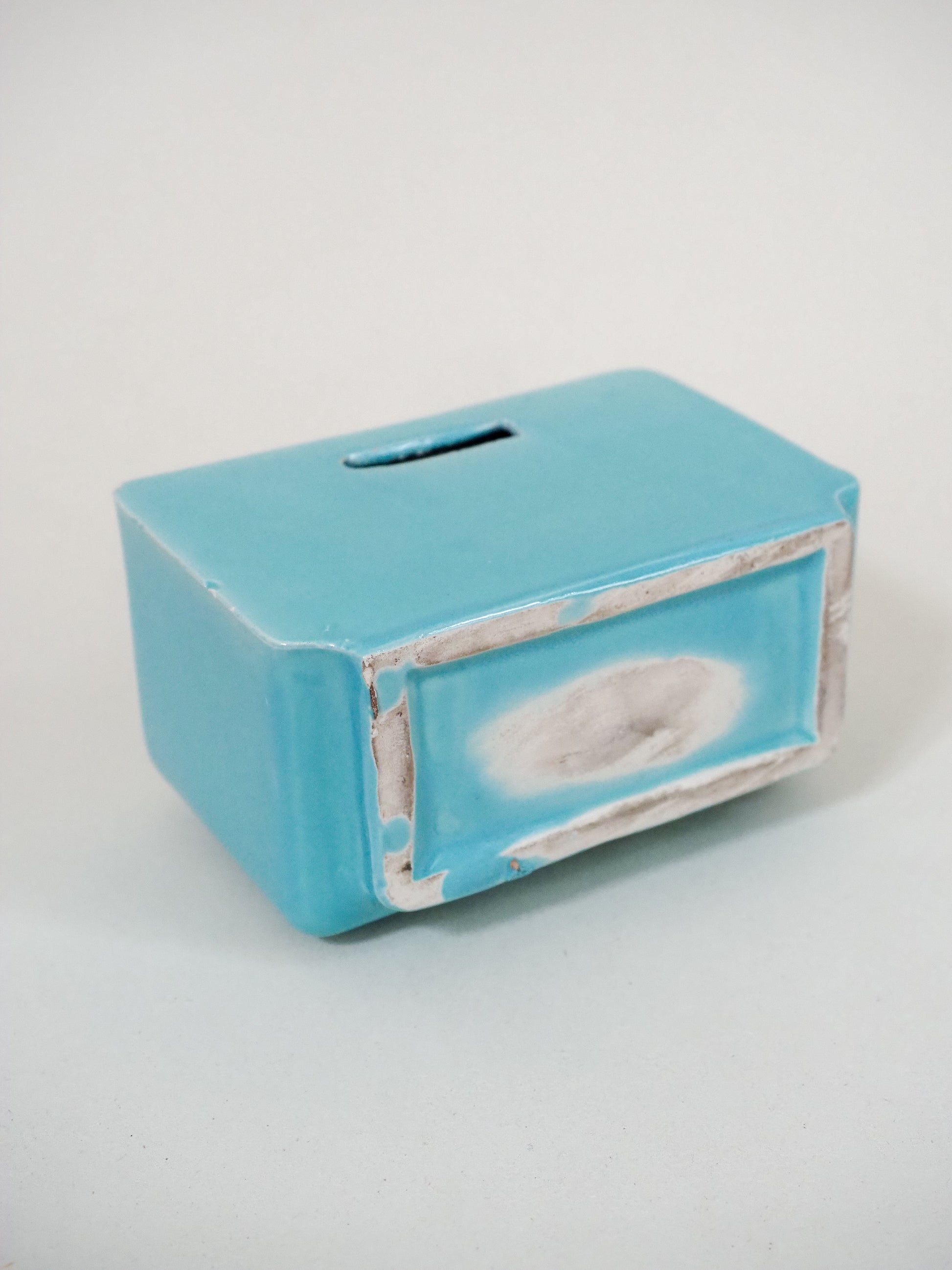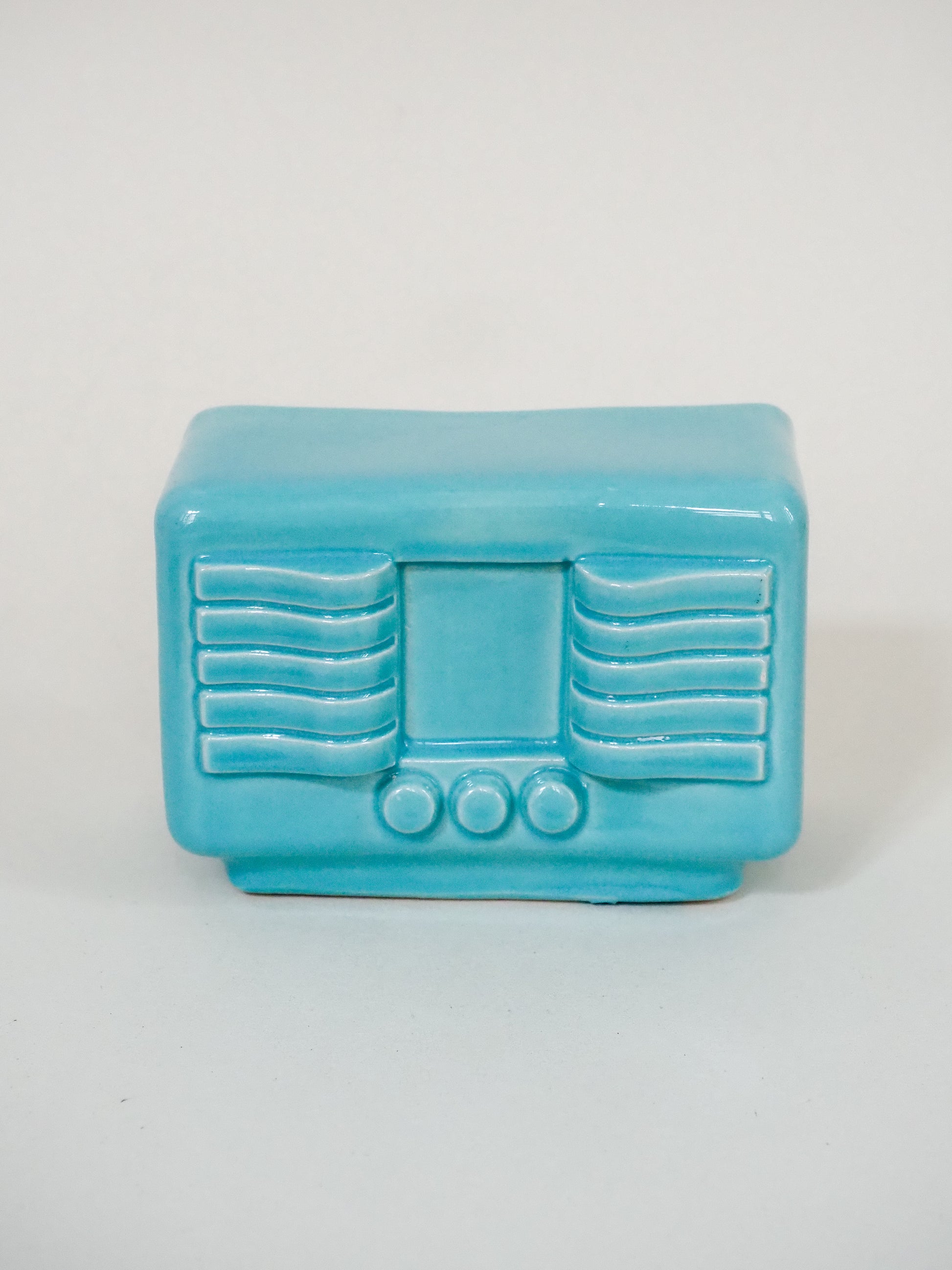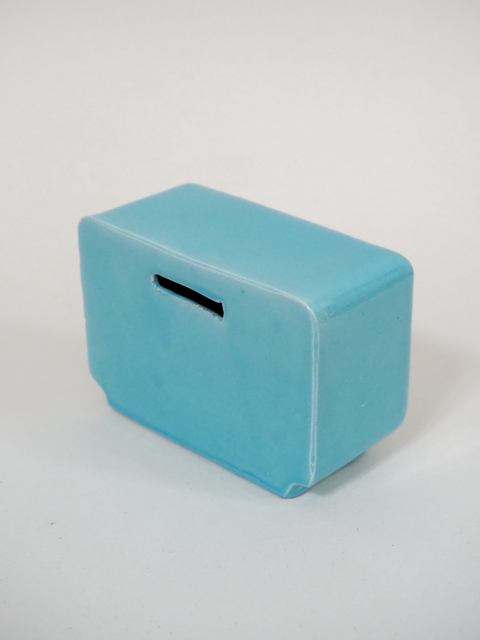 Originale tirelire à casser en céramique émaillée bleue turquoise, représentant un poste de radio TSF. Probablement fabriquée par St Clément dans les années 1950 ou 1960, bien que non estampillée. Ce type de tirelire, sans trappe de récupération, était conçu pour être cassé une fois plein, ce qui en fait aujourd’hui une pièce rare, conservée intacte.
